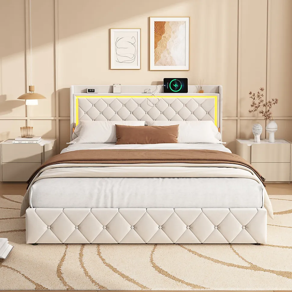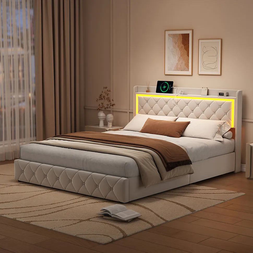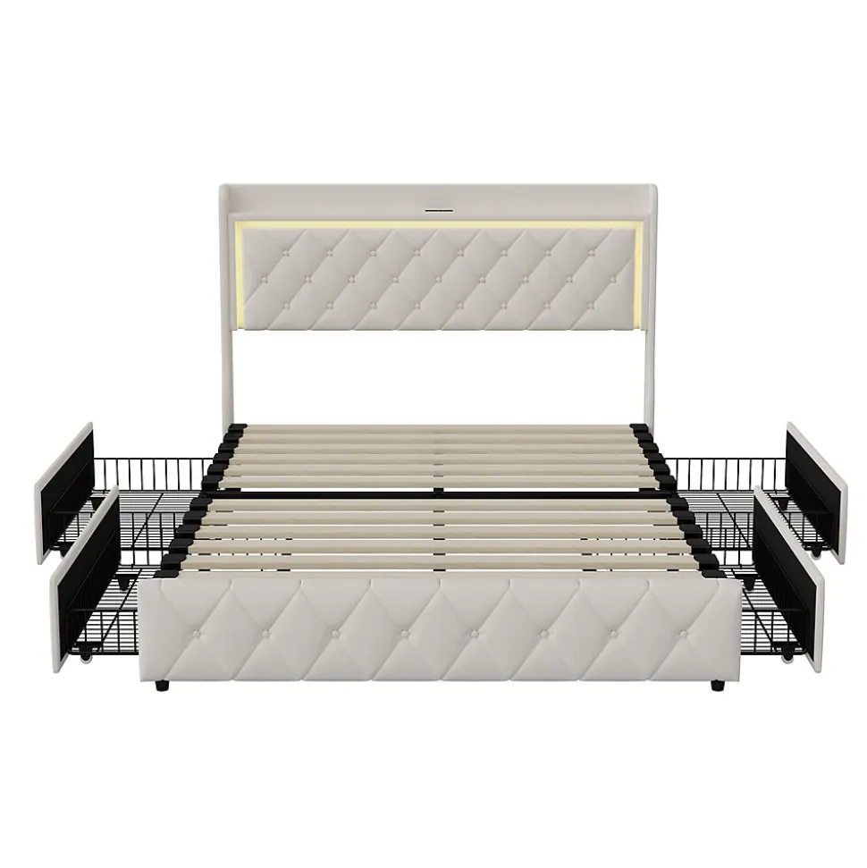 lit avec rangement : ce lit double dispose d’un espace de rangement astucieux. Des tiroirs métalliques permettent de ranger vêtements, draps et autres effets personnels de manière organisée. Ces tiroirs spacieux sont faciles d’accès et offrent un rangement pratique pour vos besoins quotidiens. lit avec éclairage led : ce cadre de lit est équipé d’un éclairage led, apportant une touche moderne et élégante à votre chambre. L’éclairage led crée une atmosphère chaleureuse et confortable. Des tables de chevet moelleuses améliorent encore le confort. Ce design élégant s’intègre parfaitement à différents styles d’intérieur. tiroirs métalliques de haute qualité : les tiroirs métalliques de la table de chevet sont robustes, durables et entièrement fonctionnels. Les tiroirs de rangement coulissants facilitent l’accès aux articles. Lorsqu’ils ne sont pas utilisés, les tiroirs se fixent facilement au lit. lit avec port usb: le port usb intégré à la tête du lit est un atout pratique pour recharger vos appareils avant de vous coucher. Le matériau souple réduit efficacement les risques de chocs dus aux angles vifs. assemblage facile : ce sommier à lattes est facile à monter, ce qui permet un montage rapide et facile. Les instructions sont claires et faciles à comprendre, et les pièces sont clairement étiquetées. Nul besoin d’être un bricoleur expérimenté pour assembler ce lit facilement.