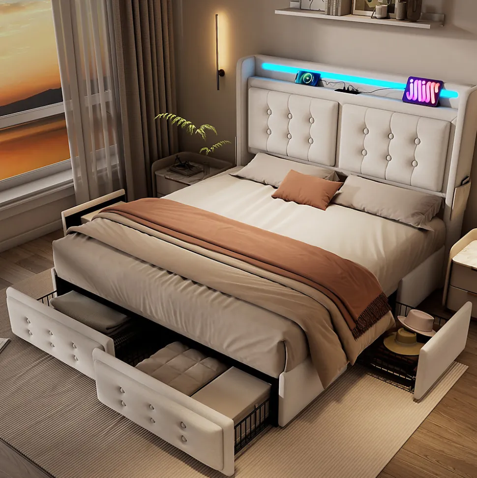 - 【Grande Capacité de Rangement】 Quatre tiroirs spacieux sous le lit offrent un stockage organisé grâce à des compartiments internes, permettant de ranger literie, vêtements et accessoires tout en maintenant la chambre impeccable et fonctionnelle.