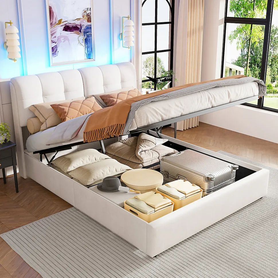 Design moderne: Notre lit de rangement moderne est équipé d’un système hydraulique, d’un sommier à lattes et d’un éclairage LED pour un sommeil réparateur dans votre chambre à coucher. La tête de lit est dotée d’un dossier rembourré pour vous permettre de vous appuyer confortablement.Tête de lit avec LED: ajoutez une touche de modernité à votre espace de sommeil avec cette tête de lit éclairée par LED. Sa lumière, modifiable par télécommande, donne le ton selon votre humeur et illumine subtilement votre espace nuitLit avec fonction rangement: Le coffre de lit sous le sommier à lattes pliant offre beaucoup d’espace pour ranger les couvertures, les oreillers ou les draps, et le sommier à lattes se replie facilement à l’aide du cylindre de levage.Structure solide: Le cadre principal du lit double est en fer et le sommier à lattes est composé de lattes élastiques en bois massif pour offrir un soutien confortable pendant le sommeil. Avec une capacité de charge de 330 kg, le lit assure la stabilité.Montage facile : Pour réduire le risque de dommages, ce lit est expédié dans 2 cartons et peut arriver à des jours différents. Vous pouvez l’installer en suivant les instructions claires (la version française n’est pas garantie).Détails du produitDimensions (L x l x H) : 220×140.5/160.5 x 100.5 cmCouleur: BeigeMatériau: Velours, Bois, MétalMatelas applicable (matelas non inclus) : 140/160×200 cmDistance de la tête de lit : 27 cmNombre de lamelles : 12Poids : 54 kg, 56.5kgPoids maximal supporté : 300 kgAssemblage requis : ouiQuantité du paquet : 2