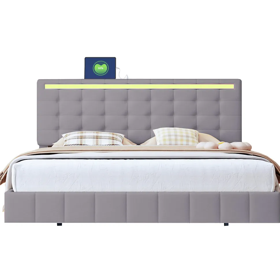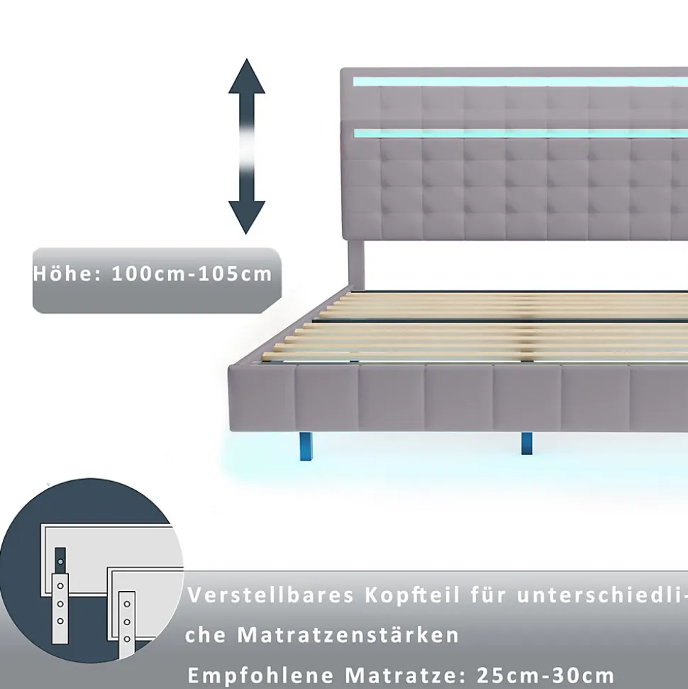 Construction robuste et durable : Le cadre de lit est fabriqué en MDF massif et panneaux de particules, soutenu par un support en métal en forme de croix robuste qui offre une base dense et sûre. Cela garantit une stabilité à long terme et empêche une tête de lit vacillante.Dimensions généreuses et capacité de charge élevée : Avec des dimensions de 210 x 172 x 100-105 cm, le lit offre suffisamment d’espace pour un sommeil réparateur. La capacité de charge élevée de 250 kg garantit que le lit reste stable même en cas d’utilisation par plusieurs personnes.Options de taille polyvalentes pour répondre aux besoins individuels : Le lit est disponible en deux tailles pour répondre aux différents besoins d’espace et s’assurer qu’il s’adapte à différentes tailles de pièce. Cela permet une conception flexible de la zone de couchage en fonction des préférences personnelles.