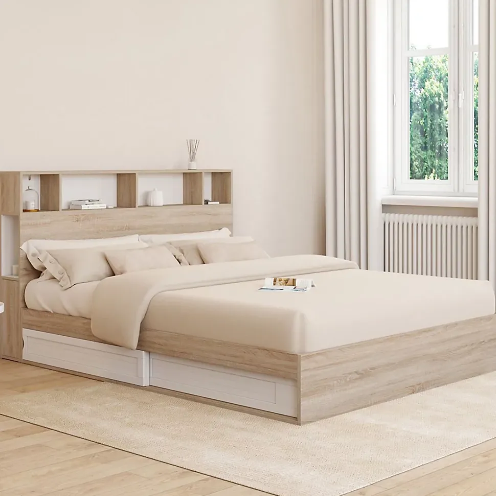 Gagnez de la place de façon astucieuse avec le lit double CLEM effet bois et blanc 160 x 200 cm.Celui-ci est composé d’un cadre de lit avec deux grands compartiments de rangement vous permettant d’y entreposer vos couettes, couvertures et pourquoi pas vos vêtements de la saison suivante. Conçu pour les petits comme les grands espaces, l’ouverture des compartiments se fait à l’aide de portes coulissantes. Le lit CLEM 160 x 200 cm est également composé d’une grande tête de lit tendance et fonctionnelle avec de nombreux rangements. Les niches frontales vous permettront d’y déposer un réveil, une lampe de chevet, une petite plante ou quelques éléments de décoration. Les niches latérales quant à elles, fermées en partie à l’aide d’une porte pression, vous permettent d’y ranger vos livres ou encore nécessaires de nuit de façon discrète et optimale Le lit double CLEM avec rangement s’intégrera parfaitement à votre intérieur grâce à la pureté de ses lignes ainsi qu’à ses couleurs épurées effet bois et blanc. Son design sobre et tendance apportera une touche de fraîcheur et de luminosité à votre chambre à coucher.Sa taille de 160 x 200 cm conviendra parfaitement pour un matelas standard double. De plus, son sommier, composé de 22 lattes, vous offrira un soutien optimal pour votre matelas et un meilleur confort pendant votre sommeil.À la fois pratique et esthétique, ce lit ultra fonctionnel saura trouver sa place dans votre chambre à coucher ou dans une chambre d’amis. N’attendez plus et optez pour le lit double CLEM avec ses rangements et son sommier 160 x 200 cm inclus !Dimensions du lit double CLEM 160 x 200 cm avec rangementsDimensions globales : Longueur 223 cm x largeur 165 cm x Hauteur 105 cmDimensions globales du lit : L. 205 x l. 165 x H. 30 cmNombre de lattes : 22Hauteur du tiroir : 17,50 cm (2 tiroirs)Dimensions intérieures du rangement : 99,50 x 80 x 22,50 cmDimensions globales de la tête de lit : L. 165 x l. 20 x H. 105 cmDimensions grande niche frontale : L. 44,