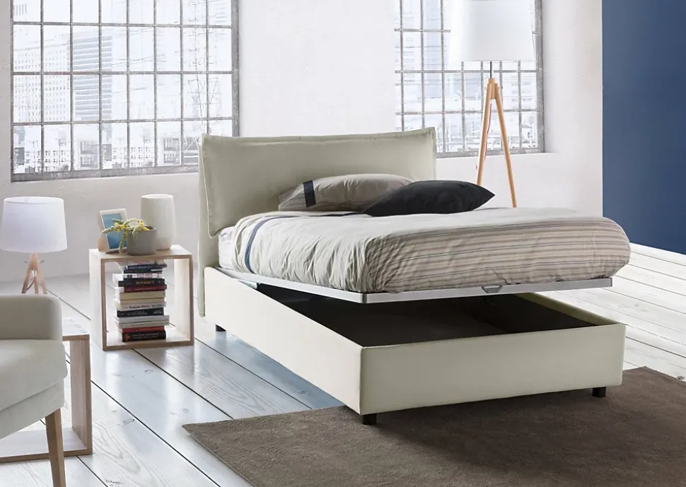 LIT CARRÉ ET DEMI-LIT – Lit coffre avec revêtement en tissu, 100% Made in Italy, Ouverture frontale, avec matelas 120×200 cm inclus, Beige. STRUCTURE – La structure du lit est en fibre de bois surélevée du sol avec des pieds en ABS et est recouverte de tissu polyester déhoussable et lavable en machine à 30° – La tête de lit linéaire assortie en tissu avec coutures apparentes est solide et résistante – Le sommier à lattes en contreplaqué est inclus dans la structure – Mécanisme d’ouverture en fer – L’ajout du coffre pratique peu encombrant permet de transformer le lit en un coffre spacieux pour draps, oreillers et couettes. MADE IN ITALY – L’article est produit en Italie, avec l’utilisation des meilleurs matériaux et la plus haute qualité et attention aux détails – Le soin des processus de production est synonyme de fiabilité, de résistance et de raffinement – Made in Certification Italy est une garantie de pleine conformité avec la réglementation de l’Union européenne. MATELAS INCLUS – Matelas orthopédique amovible, anatomique et climatisé avec double support mesurant 120×200, hauteur 21 cm – Structure en polyuréthane expansé solide h 17 cm, densité 30EP recouverte d’une mousse viscoélastique à mémoire de forme h 2 cm, densité 55EP diamant- coupé dans la partie supérieure – Revêtement en tissu stretch 130 g, déhoussable et lavable en machine à 60° – Rembourrage 100% en fibre polytechno, hypoallergénique et anti-acariens – Equipé d’une bande tri-space respirante avec zip et poignée en tissu – Certifié OekoText article. MESURES ET OUVERTURE – Dimensions du lit: Longueur 215 x Largeur 135 x Hauteur 95 cm (hauteur du sommier depuis le sol: 32cm) – Ouverture du conteneur: avant – Profondeur du conteneur: 20 cm environ – Hauteur des pieds: 10 cm environ – Fond de lit en mélamine d’une épaisseur de 1 cm – Dimensions matelas: 120×200 cm