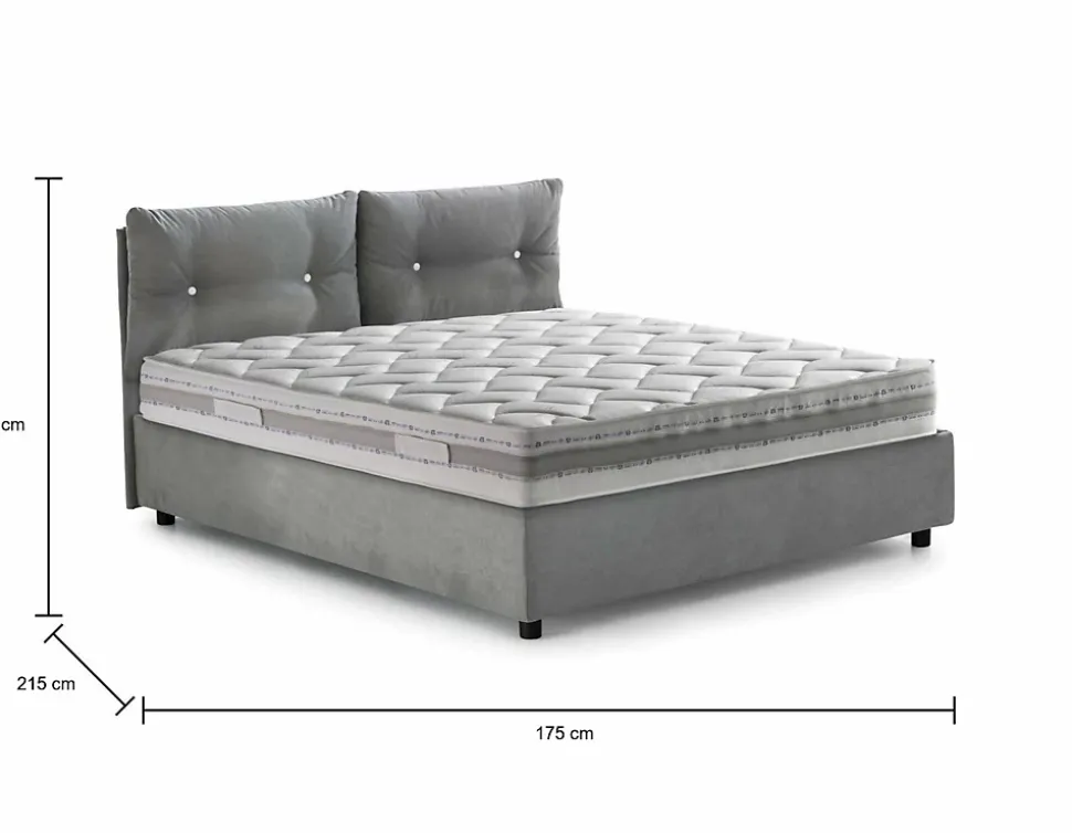 LIT DOUBLE – Lit coffre avec revêtement en tissu, 100% Made in Italy, Ouverture frontale, avec matelas 160×200 cm inclus, Gris. STRUCTURE – La structure du lit est en fibre de bois surélevée du sol avec des pieds en ABS et est recouverte de tissu polyester amovible, lavable en machine à 30° – La tête de lit combinée avec coussins rembourrés et coutures en tissu est solide et résistante – Le sommier à lattes en contreplaqué est inclus dans la structure – Mécanisme d’ouverture en fer – L’ajout du coffre pratique peu encombrant permet de transformer le lit en un coffre spacieux pour draps, oreillers et couettes. MADE IN ITALY – L’article est produit en Italie, avec l’utilisation des meilleurs matériaux et la plus haute qualité et attention aux détails – Le soin des processus de production est synonyme de fiabilité, de résistance et de raffinement – Made in Certification Italy est une garantie de pleine conformité avec la réglementation de l’Union européenne. MATELAS INCLUS – Matelas orthopédique amovible, anatomique et climatisé avec double support mesurant 160×200, hauteur 21 cm – Structure en polyuréthane expansé solide h 17 cm, densité 30EP recouverte de mousse viscoélastique à mémoire de forme h 2 cm, densité 55EP taille diamant en partie haute – Revêtement en tissu stretch 130 g, déhoussable et lavable en machine à 60° – Rembourrage 100% fibre polytechno, hypoallergénique et anti-acarien des deux côtés – Equipé d’une bande tri-space respirante avec zip et poignée en tissu – Article certifié OekoText. MESURES ET OUVERTURE – Dimensions du lit: Longueur 215 x Largeur 175 x Hauteur 95 cm (hauteur du sommier depuis le sol: 32cm) – Ouverture du conteneur: avant – Profondeur du conteneur: 20 cm environ – Hauteur des pieds: 10 cm environ – Fond de lit en mélamine d’une épaisseur de 1 cm – Dimensions matelas: 160×200 cm