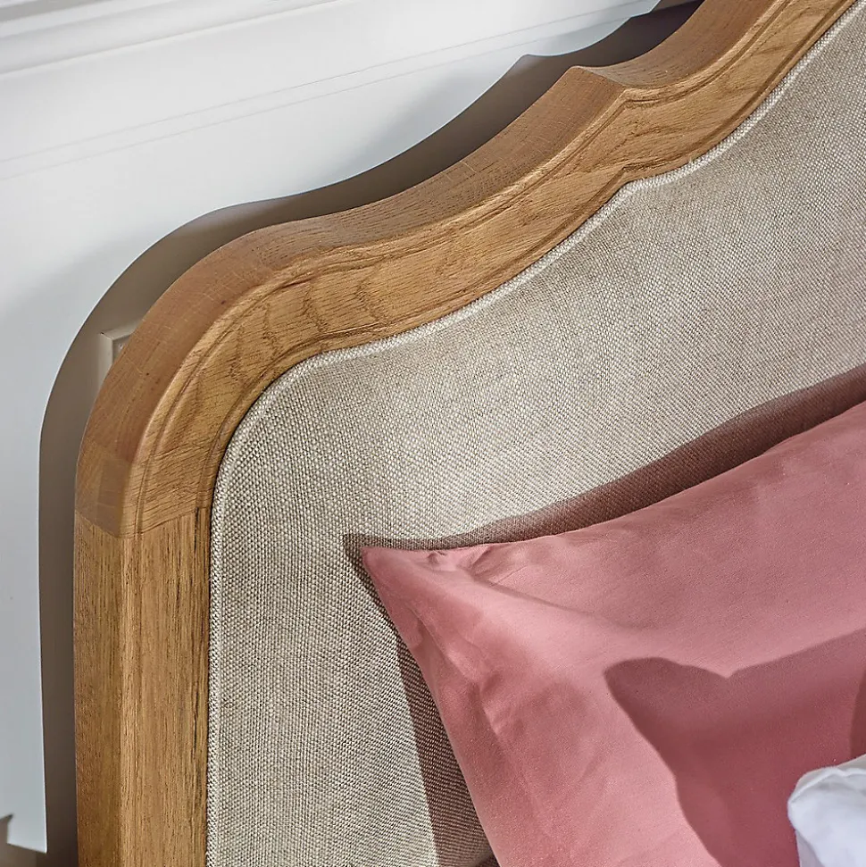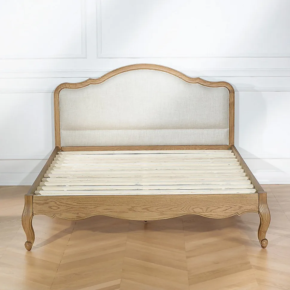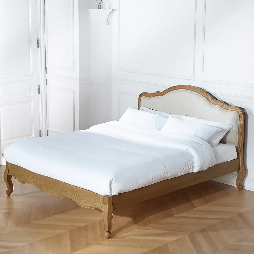 Description du produit Invitez le charme du style Shabby chic dans votre intérieur avec le lit HENRY. Son design aux lignes galbées et harmonieuses crée une atmosphère douce et relaxante, idéale pour transformer votre chambre en véritable cocon. La solidité de sa structure et de ses pieds en chêne massif promet une excellente tenue dans le temps. Sa tête de lit, délicatement habillée de lin premium, apporte élégance et confort au quotidien. Prévu pour accueillir un matelas de 140 x 190 cm il est équipé de 13 lattes en multiplis et d’une barre centrale pour une parfaite stabilité. De plus, son espace sous le cadre peut accueillir vos housses de couette, boîtes de rangement, chaussures ou encore valises fines pour optimiser l’organisation de votre chambre. Adopter le lit HENRY, c’est choisir un espace pensé pour le bien-être : idéal pour s’installer confortablement avec un livre, profiter d’un petit-déjeuner au lit ou simplement se détendre dans une ambiance paisible. Existe également en version 160 x 200 cm. Pourquoi vous allez l’aimer ? Ce lit reprend les codes du mobilier classique avec ses pieds galbés en volute qui rappellent l’esprit Louis XV et apportent une silhouette légère. Sa tête de lit chantournée, encadrée de bois mouluré et tapissée d’un tissu lin premium, adoucit l’ensemble et invite au confort. Caractéristiques utiles Livré à assembler hauteur des pieds : 39 cm Hauteur entre les lattes et la tête de lit : 21,5 cm Inspiration déco Associez notre lit HENRY à notre commode OLIVIA pour une chambre élégante et harmonieuse. L’engagement Robin des bois Sélection rigoureuse des matériaux, issus de sources responsables. Finitions durables, pensées pour vous accompagner au quotidien. Robin des Bois, c’est aussi une maison attentive au service et à la relation client. Contactez notre service client au 09 86 33 85 85 pour plus de renseignements.