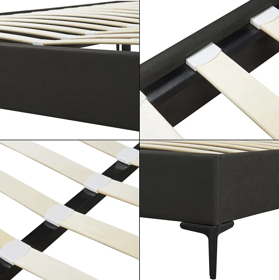 Lit doubleCe cadre de lit élégant apporte à la chambre une atmosphère accueillante, idéale pour la détente et le repos. Avec son design épuré, il s’adapte aisément à différents styles d’aménagement.Le revêtement en tissu résistant s’ajuste parfaitement au cadre, offrant une base stable et solide en combinaison avec le sommier à lattes. Cette construction fiable favorise un sommeil profond et réparateur.Gâce à sa structure robuste et ses 4 pieds stables, ce lit garantit chaque nuit un soutien sûr et confortable, transformant la chambre en un havre de paix propice aux beaux rêves.Points forts :- lit double au look sobre et élégant- convient à différents styles d’aménagement- support de matelas stable avec sommier à lattes- 4 pieds robustes- montage rapide et facile- capacité de charge jusqu’à 220 kgMatière :- cadre : contreplaqué- housse : tissu (100% polyester)- pieds : métalDimensions :- totales (lo x la x ha) : 200 x 180 x 34,5 cm- surface de couchage (lo x la) : 200 x 180 cm- hauteur des pieds : 15 cmCouleur :- cadre : noir- housse : gris foncéContenu de la livraison :1 x cadre de lit avec sommier à lattes1 x housse en tissuNote :Matelas, coussins, couverture et décorations non inclus dans la livraison.Remarque :Pour des raisons logistiques, le retrait par le client n’est pas disponible. La livraison est effectuée jusqu’au trottoir ou à la porte d’entrée, sans montage.Produit de la marque :[en.casa]
