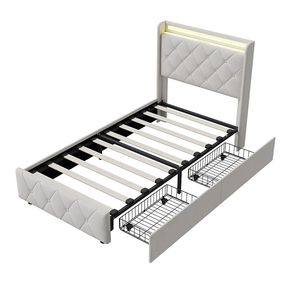 1. Tête de lit avec station de charge intégrée : Équipée d’un port USB et d’un port USB-C, idéale pour recharger téléphone, tablette ou autres appareils directement depuis le lit.2. Éclairage LED multicolore : Bande LED intégrée offrant plusieurs couleurs pour créer une ambiance personnalisée et chaleureuse dans la chambre.3. Grand espace de rangement avec tiroirs : 2 tiroirs spacieux montés sur roulettes, faciles à manipuler et parfaits pour optimiser le rangement du linge de lit ou des vêtements.4. Revêtement en flanelle de haute qualité : Tissu doux, protecteur et agréable au toucher, assurant un excellent confort et une bonne respirabilité.5. Design moderne et fonctionnel : Structure stable, lignes épurées et finition soignée, adaptée à une chambre contemporaine tout en maximisant l’espace.Détails du produit :Dimensions totales : 212 x 95 x 114 cm (L x l x h).Surface de couchage : 90 x 200 cm.Couleur : Beige.Poids net/brut : 36 kg.Matériau du panneau : MDF + métal.Poids maximal de l’utilisateur : 200 kg.Nombre de colis : 1.Assemblage requis : oui.&Remarques&※ En raison de la mesure manuelle, un écart de 2 à 3 cm peut se produire.※ En raison de l’influence de la lumière du soleil et d’autres facteurs, il peut y avoir de légères différences de couleur.※ Si vous avez des questions pendant l’installation, veuillez nous contacter dès que possible