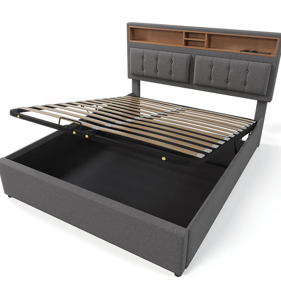 Dimensions totales :204x161x96-108cm(LxLxH)Capacité de charge :300KG/600LBSCouleur :grisPoids brut/poids net (KG) :52/48kgMatériau :Lin+métalHauteur du pied de lit :28cmNombre de paquets : 2Montage nécessaire : OuiType de matelas :Sans matelasAppui-tête réglable:L’appui-tête rembourré est rempli d’une éponge de haute densité et plus épaisse afin que vous puissiez vous détendre confortablement lorsque vous vous appuyez sur le dossier.La hauteur de l’appui-tête est réglable, et la plage de réglage de la hauteur est d’environ 12 cm de différence.Les personnes de différentes tailles peuvent trouver le meilleur point de confort en réglant la hauteur de l’appui-tête.Station de recharge avec prises et ports USB:L’une des caractéristiques les plus pratiques est la prise électrique intégrée à la tête du lit, que vous pouvez utiliser pour charger votre téléphone portable et votre tablette avant d’aller au lit.Il y a des ports USB/Type-C intégrés et des prises européennes à la tête du lit.Des rangements flexibles et spacieux:La tête de lit de 50 cm de haut présente un design d’armoire avec quatre compartiments généreux. Grand espace de rangement sous le sommier à lattes avec beaucoup d’espace de rangement pour les couvertures, les oreillers ou le linge de lit, le sommier à lattes peut être facilement replié à l’aide d’un vérin de levage. Un tissu Oxford est fixé sous le lit pour éviter la poussière.Détails raffinés:Les sommiers à lattes sont composés à 100 % de bois massif et de métal, ce qui leur confère une capacité de charge élevée et un grand confort de sommeil. Les matériaux souples du lit garantissent non seulement une sensation agréable, mais réduisent aussi efficacement les dommages causés par les coins et les arêtes vives dont vous ou votre famille souffririez probablement à l’usage.