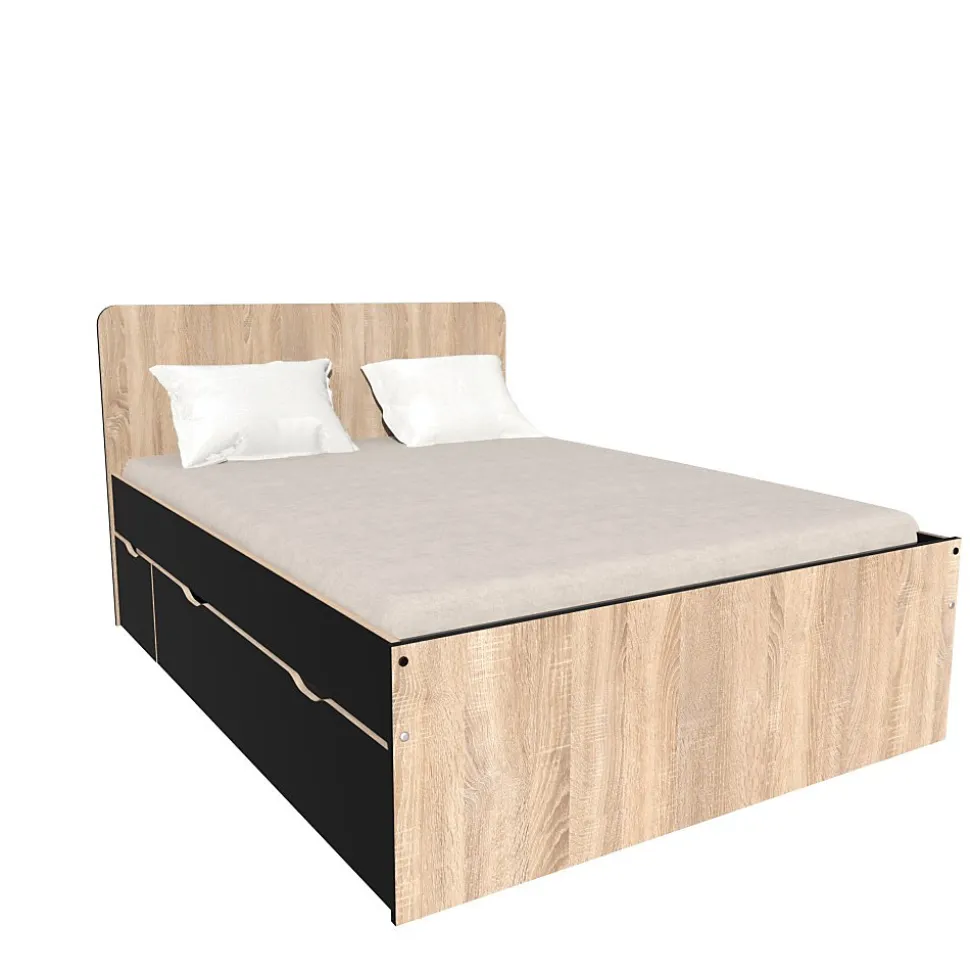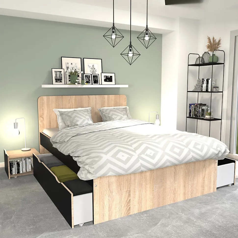 Lit double ZENIA 140 x 190 cmGagnez de l’espace dans votre chambre à coucher avec le lit ZENIA. Pratique avec ses deux tiroirs et deux chevets montés sur roulette, il convient parfaitement aux petites chambres ayant besoin de plus de rangements, sans sacrifier de mètre carré !Caractéristiques : Structure en panneau de particules.Finition : décor chêne blanchi et noir.2 tiroirs et 2 chevets intégrés.Hauteur : 49 cm – 100 cm avec tête de litDimensions intérieures chevets : 42x37x21 cmDimensions intérieures tiroirs : 144x47x22Livré démonté, sans sommier, sans matelas, prévoir un sommier à cadre. A monter soi-mêmeDimensions:195x144x100