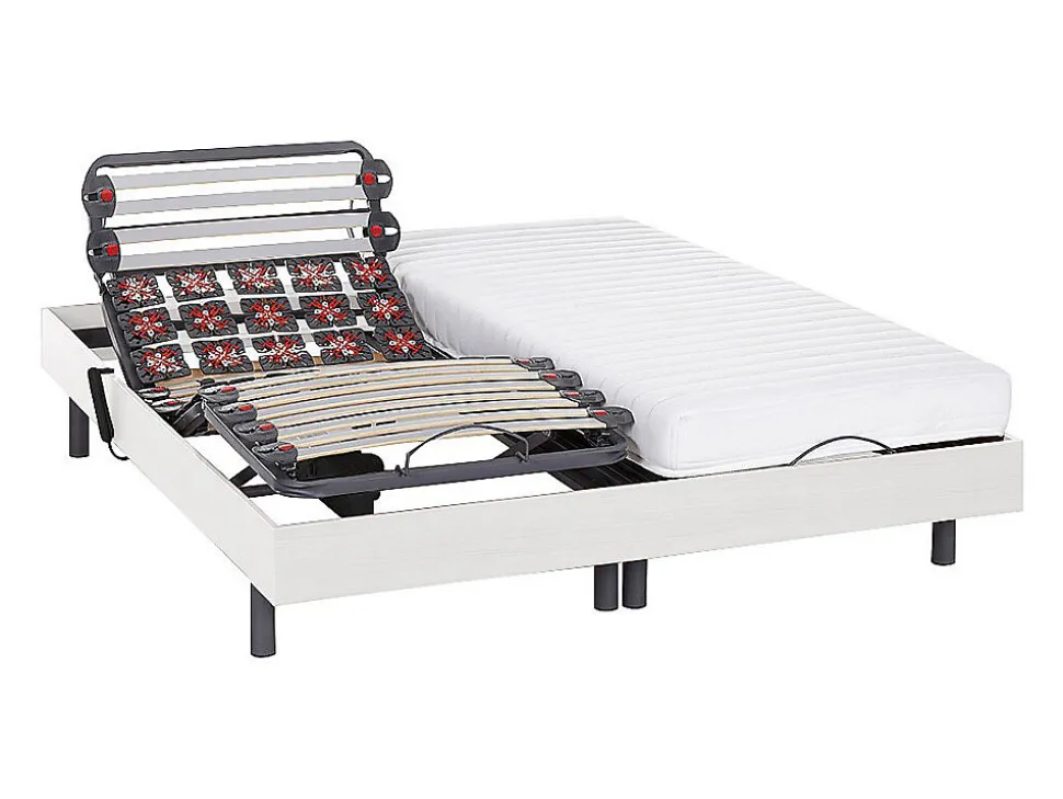 Faites le choix de l’ensemble électrique de relaxation PANDORA et son matelas accueil latex pour un sommeil de qualité.1 x Sommier de relaxation CISERANOCaractéristiques Couleur (nuance) : Blanc Matière (précision) : Mdf Taille (couchage) : 2 x 80 x 200 cm Taille : 2x80x200 cm Nombre de places : 2 places Avec pieds Technologie (sommier) : Lattes et plots Nombre de lattes : 28 lattes Option (sommier) : Barre d’arrêt Nombre de plots : 50 Plans de couchage : 5 Garantie : 5 ans Degré d’inclinaison maximum (tête) : 79 ° Degré d’inclinaison maximum (pieds) : 48 ° : Plots multidirectionnels en zone épaules et bassin pour un meilleur soutien : 8 double-lattes en zone lombaire pour allier solidité et souplesse : Lattes avec curseurs permettant de régler la fermeté : 2 télécommandesDimensions Longueur : 200 cm Hauteur : 35 cm Profondeur : 160 cm Hauteur des pieds : 20 cm2 x Matelas relaxation SAORICaractéristiques Technologie (âme) : Mousse Soutien : Ferme Densité (âme) : 20 kg/m³ Technologie matelas (accueil) : Latex Densité (accueil) : 60 kg/m³ Accueil : Moelleux Garnissage du matelas : Ouate Densité (garnissage) : 200 g/m2 Coutil (matière) : Coutil stretch Couleur (nuance) : Blanc Matière (précision) : 100 % Polyester Taille (couchage) : 80 x 200 cm Taille : 80×200 cm Nombre de places : 1 place Gamme : Good for Planet Produit : Mousse CertiPUR, Fibre OEKO-TEX, Fabriqué en France Compressé/roulé : NonDimensions Longueur : 200 cm Hauteur : 13 cm Profondeur : 80 cm Epaisseur matelas : 13 cm Hauteur de l’âme : 10 cm2 x Moteur OKIN vérin double avec télécommandeCaractéristiques Couleur (nuance) : Noir Matière (précision) : Plastique Gamme : Good for Planet Produit : Fabriqué en Europe Livré monté : Moteur puissant de 4500 NewtonDimensions Longueur : 71 cm Hauteur : 16.5 cm Profondeur : 12 cmLivraisonLors de la livraison, il est conseillé de vérifier que le bon nombre de colis a été livré.Colis1 x Sommier de relaxation CISERANOColis n°1 :