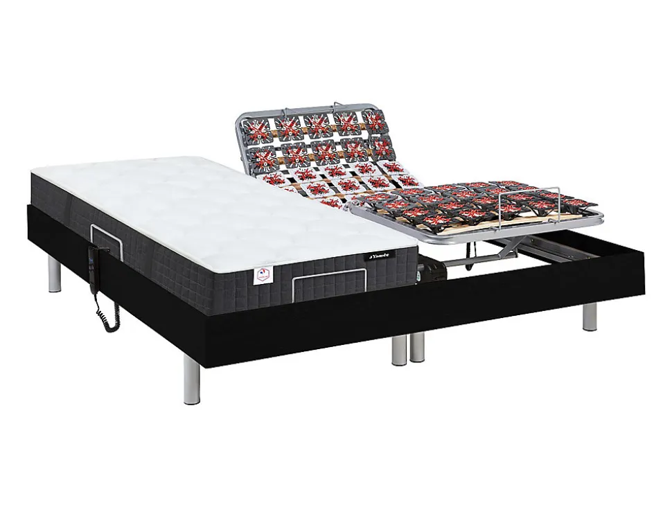 Faites le choix de l’ensemble électrique de relaxation PHANES pour un soutien point par point et un confort d’exception.1 x Sommier de relaxation NAFURICaractéristiques Couleur (nuance) : Noir Matière (précision) : Panneau et dérivés de bois Taille (couchage) : 2 x 70 x 190 cm Taille : 2x70x190 cm Nombre de places : 2 places Avec pieds Technologie (sommier) : Tout plots Option (sommier) : Barre d’arrêt Nombre de plots : 96 Plans de couchage : 5 Garantie : 5 ans Degré d’inclinaison maximum (tête) : 78 ° Degré d’inclinaison maximum (pieds) : 43 ° : 2 télécommandesDimensions Longueur : 190 cm Hauteur : 35 cm Profondeur : 140 cm Hauteur des pieds : 20 cm2 x Matelas relaxation PAROXCaractéristiques Technologie (âme) : Ressorts ensachés Nombre de ressorts (matelas) : 290 Nombre de zones : 5 zones Soutien : Ferme Technologie matelas (accueil) : Mousse à mémoire de forme Densité (accueil) : 50 kg/m³ Accueil : Enveloppant Garnissage du matelas : Laine Densité (garnissage) : 400 g/m2 Coutil (matière) : Polyester, Coutil stretch Couleur (nuance) : Blanc Matière (précision) : 100 % Polyester Taille (couchage) : 70 x 190 cm Taille : 70×190 cm Nombre de places : 1 place Réversible été/hiver, Bande 3D respirante, 4 poignées de transport, Carénage Gamme : Good for Planet, Espace pro Produit : Mousse CertiPUR, Fabriqué en France Compressé/roulé : Compressé/rouléDimensions Longueur : 190 cm Hauteur : 24 cm Profondeur : 70 cm Epaisseur matelas : 24 cm Hauteur de l’âme : 12.5 cm2 x Moteur OKIN vérin double avec télécommandeCaractéristiques Couleur (nuance) : Noir Matière (précision) : Plastique Gamme : Good for Planet Produit : Fabriqué en Europe Livré monté : Moteur puissant de 4500 NewtonDimensions Longueur : 71 cm Hauteur : 16.5 cm Profondeur : 12 cmLivraisonLors de la livraison, il est conseillé de vérifier que le bon nombre de colis a été livré.Colis1 x Sommier de relaxation NAFURIColis n°1 : Longueur 195 cm, Largeur 75 cm, Hauteur 17 cm, Poids