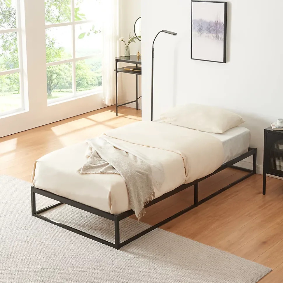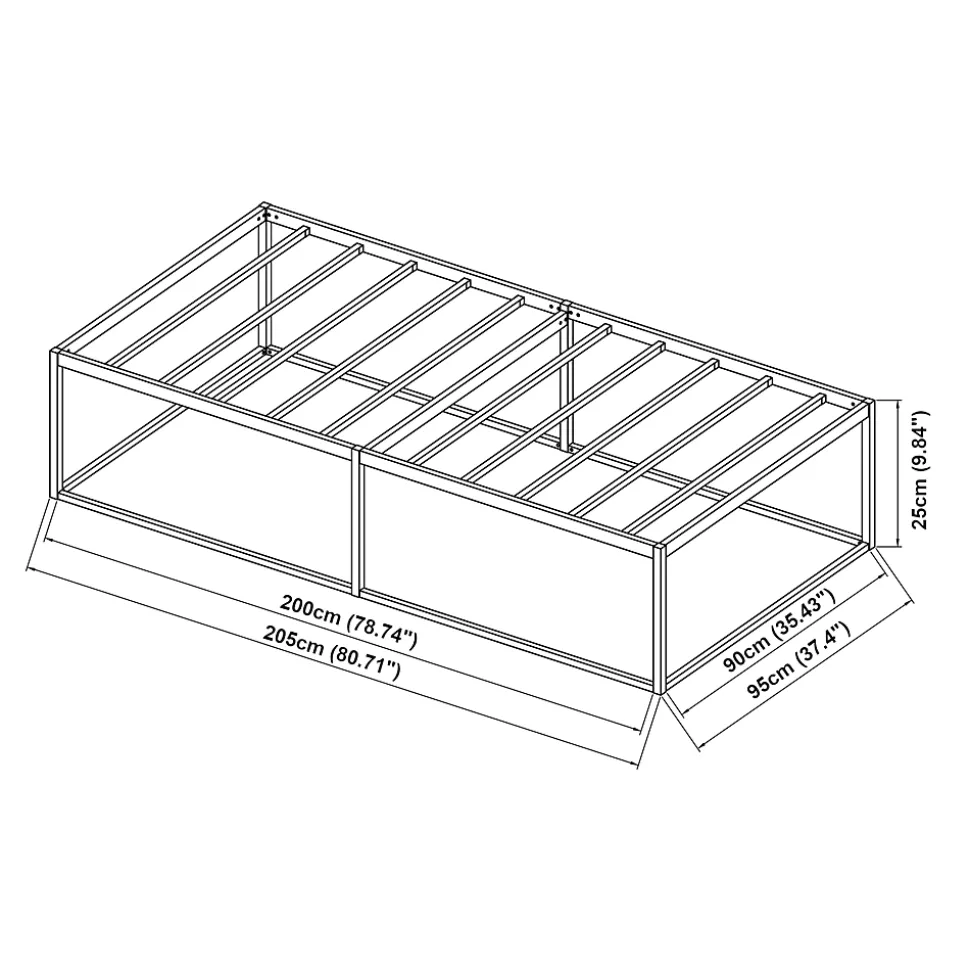 Lit en métalNotre lit moderne et intemporel, s’intègre aisément dans divers styles de décoration tout en apportant une touche d’élégance.Facile à monter gâce à des instructions claires, il vous garantit rapidement un espace de repos confortable. Sa structure métallique robuste offre une excellente stabilité et supporte une charge importante, tandis que les barres solides assurent un soutien optimal pour le matelas, favorisant un sommeil réparateur.Pratique, sa surface résistante aux rayures est facile à nettoyer, et son cadre surélevé permet une espace de rangement discret sous le lit. Transformez votre chambre en un havre de paix propice à la détente et aux doux rêves.Points forts :- lit simple intemporel et élégant- montage rapide et simple- surface résistante aux rayures et aux chocs pour une longue durée de vie- entretien facile- capacité de charge jusqu’à 150 kgMatière :acier laquéDimensions :- totales (longueur x largeur x hauteur) : 205 x 95 x 25 cm- surface de couchage (longueur x largeur) : 200 x 90 cmCouleur :noirContenu de la livraison :1 x lit en métalImportant :Le matelas, l’oreiller, la couverture et tous les autres objets de décoration ne sont pas compris dans la livraison !Remarque :Pour des raisons logistiques, le retrait sur place n’est pas possible.La livraison se fait jusqu’au trottoir ou à la porte d’entrée, sans montage.Produit de la marque :[en.casa]