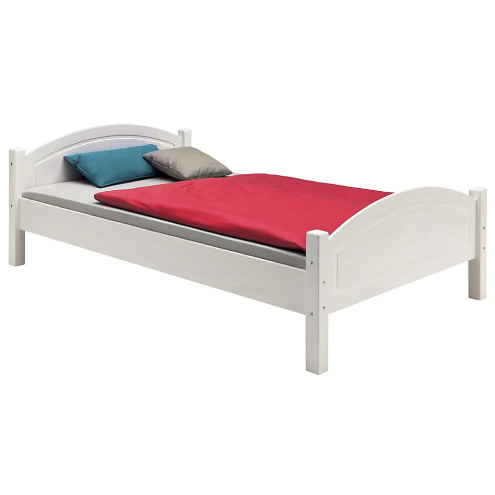 Le lit en pin Flims … apportera beaucoup de charme à votre chambre ou celle de vos enfants, grâce à son aspect naturel. Son design moderne et intemporel s’intègrera facilement avec le reste de votre mobilier. Réalisé en pin massif, il vous garantira une grande solidité et résistance. Sa tête et son pied de lit aux courbes arrondies, seront parfait pour amener un style élégant et authentique à votre intérieur. Description des matériaux : – Le cadre de lit est fabriqué en pin massif recouvert d’une lasure blanche. – La madrure du bois reste visible. Caractéristiques du produit : – Couchage 100 x 200 cm – Barre de renfort transversale – Hauteur de la tête de lit : 71 cm – Hauteur du pied de lit : 60 cm – Hauteur conseillée du matelas : 13 cm – Cadre de lit stable Livraison et montage – Contenu de la livraison: lit, sans décoration, notice de montage – Le produit est livré en pièces détachées – Assemblage facile grâce à la notice – Sans sommier et sans matelas – Photo non contractuelle Résumé: – Dimensions pieds: 64 x 64 mm – Hauteur cadre de lit: 17 cm – Hauteur pan de lit: 37 cm – Hauteur pied de lit: 60 cm – Hauteur tête de lit: 71 cm – Profondeur d’insertion: 12 cm – Convient uniquement avec: Sommier fagot à lattes – Sommier: vendu séparément – Surface: Lasuré, La madrure du bois reste visible – Dimensions monté: 71 x 108 x 201 cm (H x L x L) – Couchage: 100 x 200 cm – Couleur: Blanc – Matériel: Pin massif