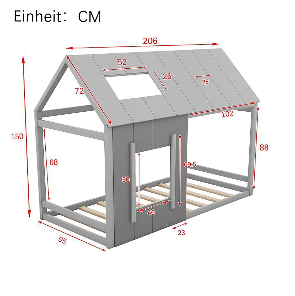 Lit enfant maison 90×200 cm (gris)Caractéristiques principalesDimensions : 206x95x150 cmMatériaux : Pin massif + MDFCharge max : 100 kgStyle : Maisonnette avec fenêtreSommier : 8 lattes en boisPoids : 29 kgLivraison en 2 colis199x27x15 cm (18 kg)112x33x15 cm (13,56 kg)Points fortsDesign original de maisonnetteStructure en pin robuste et silencieuseToit et fenêtre décoratifsMontage rapide (<1 heure)Personnalisation facileInformations complémentairesMatelas 90×200 cm non inclus (15-20 cm recommandé)Origine : ChineConvient pour premier lit d’enfantEspace de jeu intégréIdéal pour chambre d’enfant ludique et sécurisée