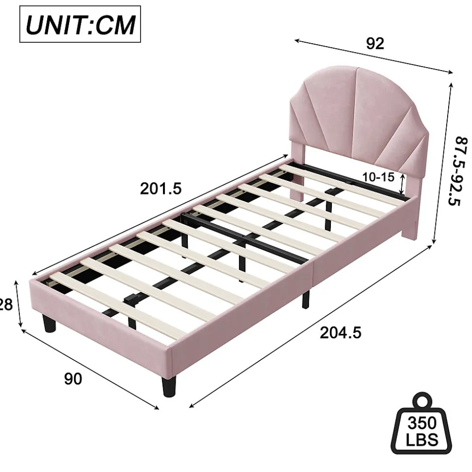 une chambre de princesse cosy et sophistiquée : ce lit enfant 90 x 200 cm est recouvert d’un velours doux et confortable pour un confort exceptionnel. La tête de lit en forme de coquillage, également recouverte de velours, est non seulement élégante, mais offre également un soutien confortable pour la lecture ou la détente. C’est le complément idéal pour la chambre de votre petite fille. tête de lit réglable pour un confort optimal : ce lit simple est doté d’une tête de lit réglable, vous permettant d’ajuster la hauteur selon les besoins de votre enfant. Que vous lisiez ou vous détendiez, profitez d’un confort personnalisé. Son design allie élégance et confort, le rendant idéal pour les enfants et les adolescents. construction robuste pour une stabilité durable : ce cadre de lit 90 x 200 cm est fabriqué en mdf et panneaux de particules pour une durabilité accrue. Grâce à des entretoises métalliques, ce lit peut supporter jusqu’à 200 kg, garantissant stabilité et durabilité. Sa construction robuste assure la longévité et empêche la tête de lit de bouger, pour une sécurité accrue. sommier à lattes renforcé pour un sommeil confortable : ce lit enfant est doté de 12 lattes renforcées qui offrent un soutien parfait au matelas (matelas non inclus). Ce système de lattes assure une répartition uniforme du poids, favorisant un sommeil de meilleure qualité. Il offre à votre enfant un confort de sommeil exceptionnel, vous permettant de l’accompagner dans sa croissance en toute sérénité. assemblage facile et rapide : ce lit 90×200 cm est fourni avec une notice de montage détaillée et tout le matériel nécessaire pour un assemblage facile. Grâce aux instructions étape par étape incluses, vous pouvez assembler ce lit rapidement et facilement. idéal pour une chambre d’enfant, ce lit allie praticité et élégance.