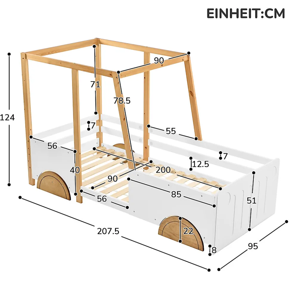 ▶ ▶ Détails ▶────────────────● Nom du produit : Lit voiture pour enfants● Couleur : Blanc + Naturel● Matériau du cadre : Pin + MDF● Matériau des lattes : Bois● Dimensions totales : 207,5 × 95 × 124 cm (L x l x H)● Poids total : 36 kg● Hauteur du sol jusqu’au dessous du lit : 8 cm● Matelas applicable : 90 × 200 cm (matelas non inclus)● Capacité de charge : 100 kg● Méthode de montage : Auto-installation● Nombre de colis : 2► Remarques ►※ Ce produit combiné est livré en 2 colis. Il est donc normal que les colis n’arrivent pas en même temps, merci de faire preuve de patience.※ Une erreur de 2 à 3 cm peut survenir en raison de la mesure manuelle.※ Des différences de couleur peuvent apparaître entre l’image du produit et le produit réel en raison des conditions lumineuses. Veuillez vous référer au produit reçu.※ Pour toute question lors de l’installation, veuillez nous contacter dès que possible.
