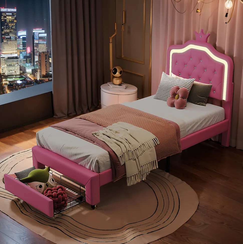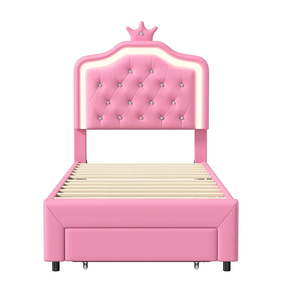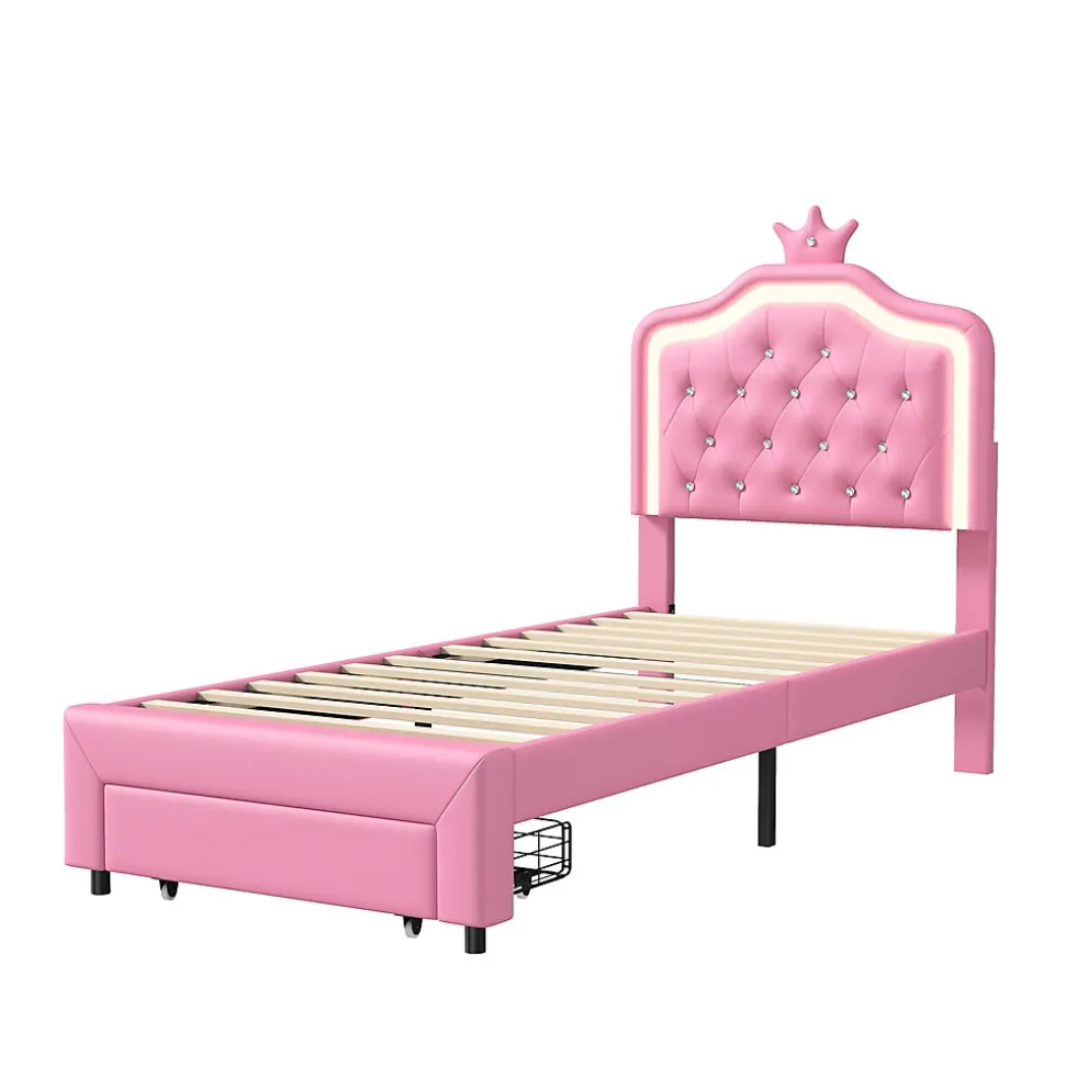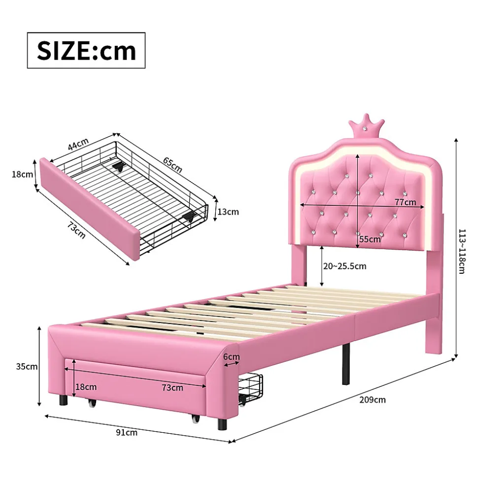 Description1. Style de design unique : la tête de lit est conçue avec des boutons en treillis et est agrémentée d’une petite couronne sur le dessus, pleine d’atmosphère de princesse ; la tête de lit réglable offre la hauteur la plus confortable pour les enfants, ce qui en fait un lit de rêve pour les filles.2. Matériau de haute qualité : il est fabriqué en matériau PU doux pour la peau, confortable, doux et imperméable, et facile à nettoyer. En même temps, les lattes en bois massif ajoutent de la stabilité au lit, assurant le confort. et la santé de l’enfant.3. Bande lumineuse LED intelligente : la tête de lit est équipée d’une bande lumineuse LED, qui prend en charge la télécommande par smartphone. La couleur et la luminosité de la lumière peuvent être ajustées à tout moment, ajoutant une atmosphère chaleureuse à la pièce.4. Conception pratique des tiroirs :tiroirs au bout du lit, qui sont pratiques pour ranger les jouets et les vêtements, ce qui permet de garder facilement la pièce bien rangée et ordonnée.5. Utilisation multifonctionnelle : ce n’est pas seulement un lit, mais aussi une œuvre d’art décorative dans la pièce, permettant aux enfants de profiter d’un environnement de sommeil sûr et confortable tout en augmentant le plaisir et la beauté de la pièce.Spécification:Dimensions : 209 x 91 x 113-118 cm (L x l x H)Matériel: PU + bois massif + métalAssemblage : à assembler soi-mêmeTiroirs : 1Charge maximale : 300 LBSMatelas applicable : 90 x200 cm (hors matelas)Détails de rangement :1 tiroirs de rangementHauteur de tête de lit réglable : Oui&Remarques&※ En raison de la mesure manuelle, un écart de 2 à 3 cm peut se produire.※ En raison de l’influence de la lumière du soleil et d’autres facteurs, il peut y avoir de légères différences de couleur.※ Ce produit sera expédié en 2 colis. Ils peuvent arriver à des moments différents. Veuillez patienter.※ Si vous avez des questions pendant l’installation, veuillez nous contacter dès que possible.