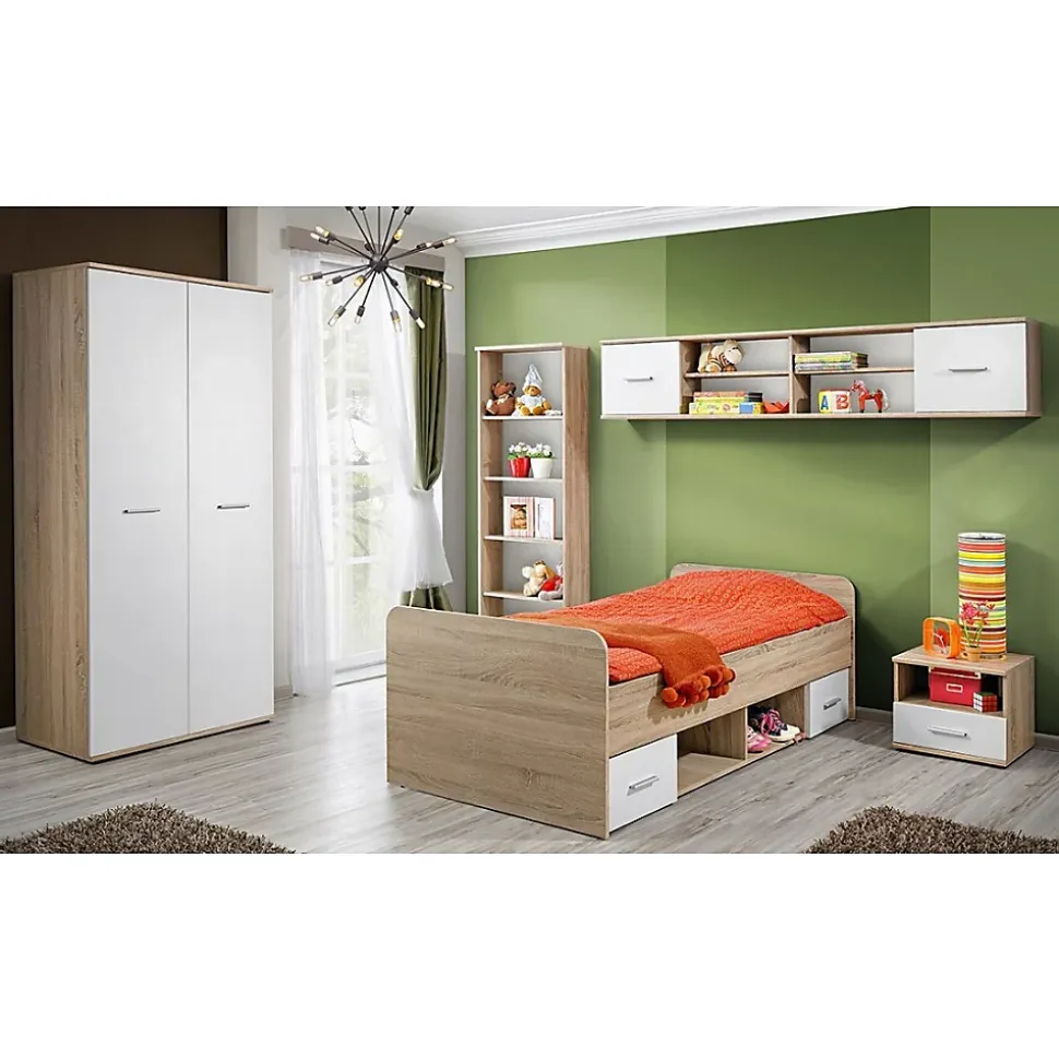 Lit enfant 90×200 collection DENVER avec 2 tiroirs et 2 niches – Coloris chêne et blanc.Ce lit pour enfant design de la collection DENVER fera de la chambre de votre enfant un véritable cocon, lui permettant de se détendre et de se reposer. Il apportera aussi de nombreux rangements grâce à ses 2 tiroirs et ses 2 niches- MODELE : Lit collection DENVER + sommier- COLORIS : Coloris chêne et façades tiroirs blanches.- STYLE : Moderne et design.- DIMENSIONS : * Lit + tête de lit : l96 x H64 x L204 cm (couchage 90×200 cm).- STRUCTURE : Panneaux de particules et MDF de première qualité.- CARACTÉRISTIQUES : Lit 90×200 avec 2 tiroirs et 2 niches. Sommier inclus MATELAS NON INCLUS (mais disponibles sur demande)Retrouvez également le reste de la collection DENVER directement sur notre boutique Castorama