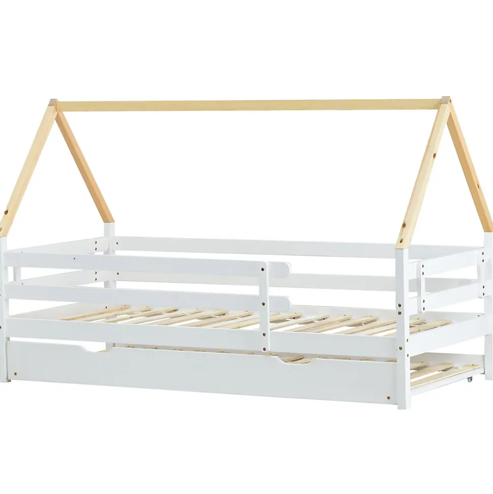 Description1. Le lit gigogne sous le sommier optimise l’utilisation de l’espace. Les invités qui passent la nuit ou les adultes accompagnateurs peuvent le déplier pour une utilisation temporaire. Même les ménages avec deux enfants peuvent répartir rationnellement l’espace de couchage tout en économisant de la place.2. Des capuchons sont fixés sur les écrous pour empêcher les enfants d’entrer accidentellement en contact avec les vis. Des détails optimisés renforcent la sécurité.3. Le cadre du lit présente une élégante finition blanche, tandis que le cadre supérieur conserve sa couleur bois naturel. Cette combinaison de couleurs classique confère à l’ensemble du lit un caractère chaleureux et distinctif.4. Le bois de pin massif garantit la solidité et la fiabilité du lit. Le renfort triangulaire à l’intérieur du cadre améliore la stabilité globale.5. Des barrières de sécurité multicouches sur les quatre côtés, associées à des panneaux de protection incurvés, protègent les enfants des chocs et des impacts. Les petits peuvent rouler et jouer sur le lit sans risque de chute.Caractéristiques techniquesDimensions hors tout : 209 x 97 x 130 cmCouleur : blanc + naturelMatériau du cadre : pinMatériau du sommier : boisPoids total : 39 kgHauteur depuis le sol : 20 cmTailles de matelas adaptées (matelas non inclus) : 90 x 200 cm et 90 x 190 cm (épaisseur du matelas ≤ 13 cm)Capacité de poids : 100 kgMéthode d’assemblage : à monter soi-mêmeNombre de colis : 2Pays d’origine : Chine