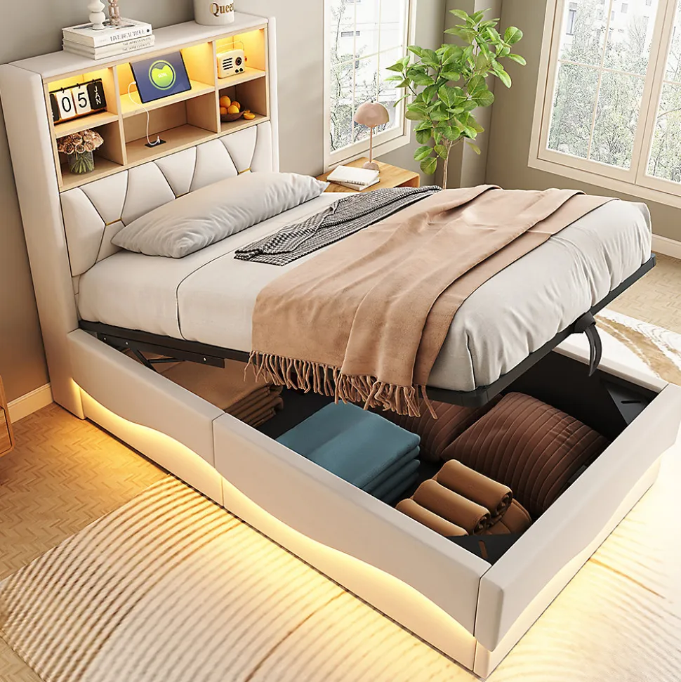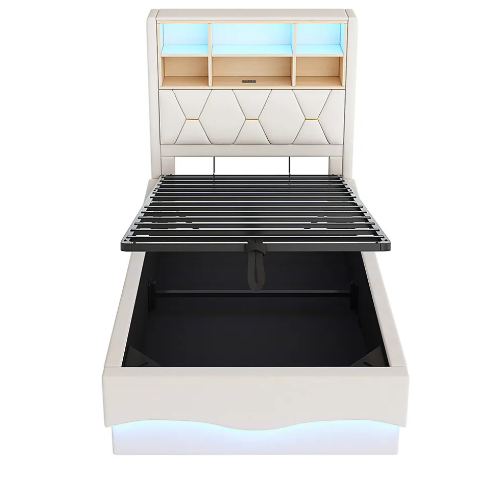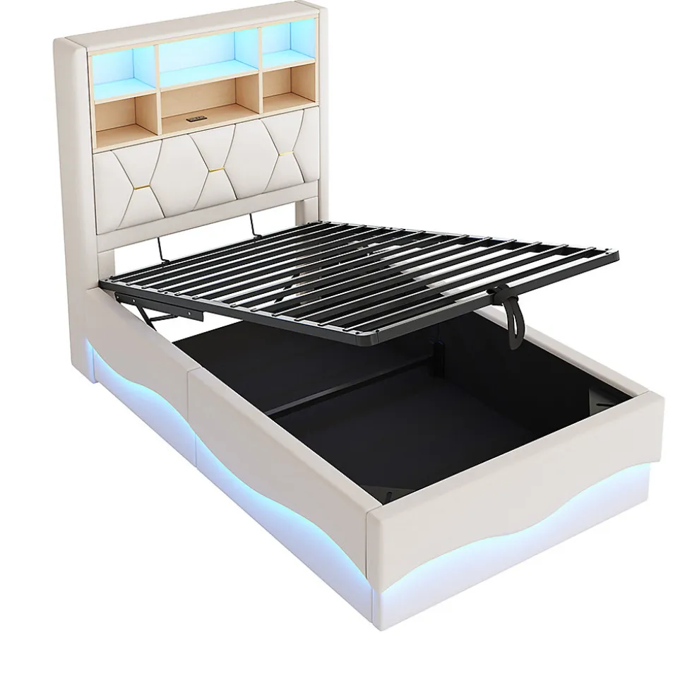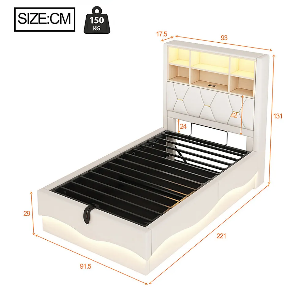 SpécificationsInformations sur le produitCouleur principale : BeigeMatériau principal : FerDimensions du produitLongueur assemblé (cm) : 221,00Largeur assemblé (cm) : 93,00Hauteur assemblé (cm) : 131,00Poids du produit (kg) : 45,00Dimensions de l’emballageSous-article 1 : 140,97 × 28,58 × 21,41 cm 23,65 kgSous-article 2 : 134,29 × 37,57 × 18,08 cm 26,5 kgCaractéristiques du produitÉclairage LED intelligent : bande lumineuse LED intégrée contrôlable via une application pour smartphone ou une télécommande. L’éclairage d’ambiance multicolore et les lampes de lecture aux tons chauds créent une atmosphère apaisante propice au sommeil.Rangement conçu scientifiquement : la tête de lit est dotée d’étagères ouvertes pour les livres, les jouets ou les objets de chevet, optimisant ainsi l’utilisation de l’espace. Le lit intègre un mécanisme de levage hydraulique qui permet d’ouvrir sans effort un espace de rangement spacieux sous le lit pour la literie, les jouets ou les vêtements de saison, économisant ainsi un espace précieux dans les chambres d’enfants.Cadre métallique robuste : le sommier à lattes renforcé de métal offre une stabilité et une capacité de charge exceptionnelles, garantissant une sécurité à long terme.Revêtement en lin doux : le cadre du lit est recouvert de tissu en lin, les quatre bords étant entièrement recouverts. La structure résistante aux chocs offre une protection aux enfants actifs.Port de chargement USB : la table de chevet est équipée d’un port USB pour recharger facilement les téléphones portables, les lampes et autres appareils pendant la nuit.