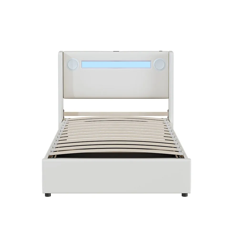 Ce lit multifonction est équipé d’un éclairage LED, d’un lecteur Bluetooth et de 2 ports USB pour charger vos appareils. Le grand coffre de rangement sous le sommier, à ouverture hydraulique, remplace aisément une armoire. Parfait pour optimiser l’espace dans une chambre moderne.Le revêtement en simili cuir est facile à nettoyer, résistant à l’eau et à la saleté. Disponible en blanc (AAW) ou blanc/noir (AAB).Caractéristiques techniques :Dimensions : 212,5 x 96,5 x 103 cmNombre de colis : 2Poids : 36 kgCapacité de charge : 150 kgÉpaisseur de matelas recommandée : max. 28 cm (matelas non inclus)Matériaux : MDF + métal + PUNombre de lattes : 12Couleur : Blanc / Blanc & NoirMontage : environ 30 minutesOutils inclus : Oui (tournevis fourni)Nombre de personnes recommandées pour l’assemblage : 2