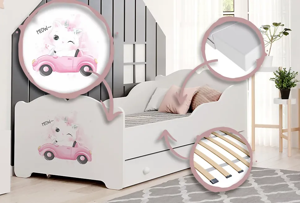 - Design féminin et universel – la couleur blanche et l’imprimé délicat font que le lit s’adapte à différentes décorations intérieures.