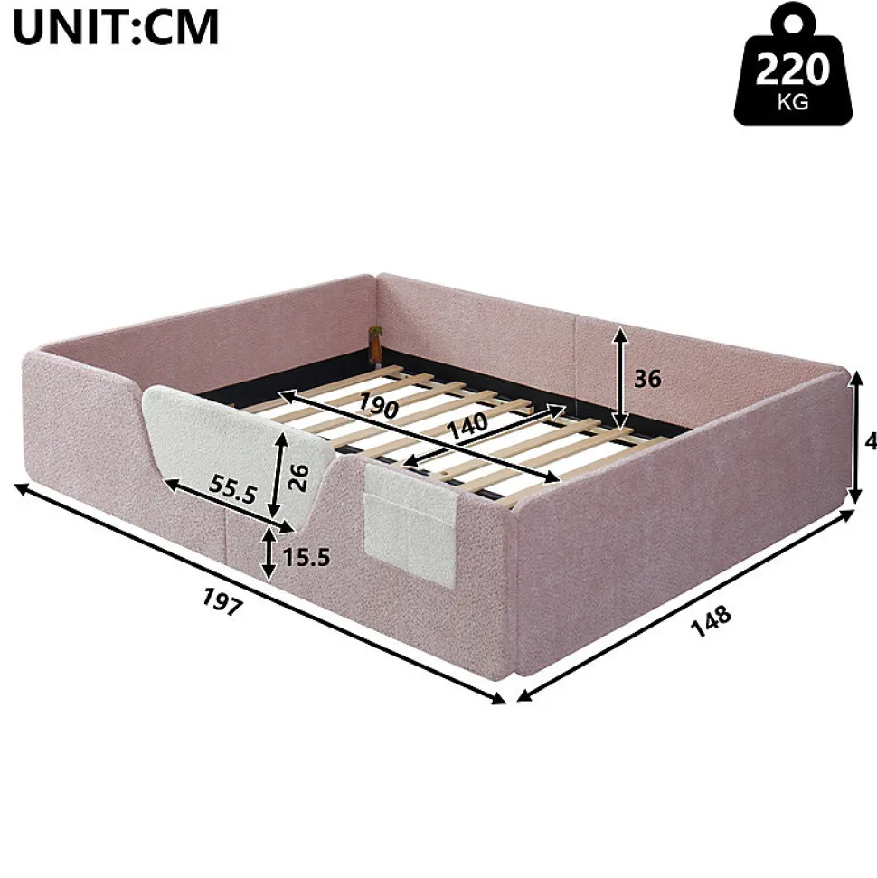 Spécifications● Couleurs du produit : Rose● Dimension du produit : 197x148x42cm● Matériau du produit : MDF+Velours● Poids du produit : 30kg● Capacité de charge : 220kg● Épaisseur recommandée du matelas : 10-15cm(Matelas non inclus)● Montage requis : Oui● Nombre de colis : 2Attentions● Ce produit est divisé en 2 colis pour la livraison. Il se peut qu’ils n’arrivent pas en même temps. Merci d’attendre patiemment.● La livraison comprend un cadre de lit, un sommier à lattes. Le matelas n’est pas compris dans la livraison.● Si vous avez des questions pendant l’installation, veuillez nous contacter dès que possible.● Remarque importante : en raison de la taille importante de cet article, il est possible qu’il soit expédié en plusieurs colis. Les colis peuvent arriver séparément. Veuillez vérifier si vous avez reçu un e-mail contenant plusieurs numéros de suivi après avoir reçu la notification d’expédition afin de pouvoir suivre la livraison de chaque colis.