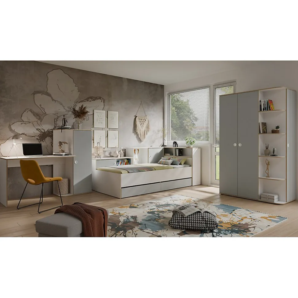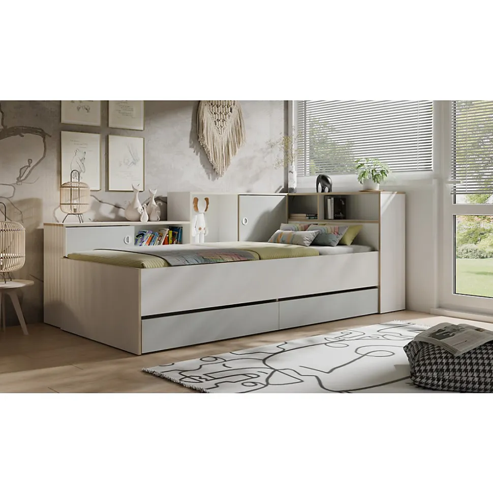 Lit enfant ELYO 90×200 cm avec rangements – Coloris gris, blanc et chêne clairOptimisez l’espace de la chambre de votre enfant avec le lit enfant ELYO. Plus qu’un simple couchage, ce modèle astucieux combine confort et nombreux rangements pour un espace organisé et fonctionnel. Son design moderne, avec une association de gris et blanc rehaussée par une finition effet chêne clair, apporte une touche chaleureuse et élégante.Un lit avec de multiples rangementsCe lit enfant de 90×200 cm est équipé de :2 tiroirs spacieux parfaits pour le linge de lit, les jouets ou vêtements.Des niches ouvertes pratiques pour garder les livres ou objets préférés à portée de main.Des niches fermées avec portes battantes pour un rangement discret.Des étagères intégrées idéales pour une organisation optimale.Un véritable meuble multifonction qui permet de gagner de la place tout en offrant un couchage confortable.Qualité et praticitéFabriqué en panneaux de particules et MDF de première qualité, le lit ELYO assure robustesse et longévité. Sa structure stable et bien pensée facilite le quotidien des enfants comme des parents. Matelas et sommier non inclus, sommier fourni.Les atouts du lit enfant ELYOLit 90×200 cm avec nombreux rangements2 tiroirs, niches ouvertes et fermées, étagères intégréesDesign moderne gris, blanc et effet chêne clairFabrication européenne robuste et de qualitéParfait pour optimiser les petits espacesLa collection ELYO : des meubles pratiques pour chambre enfantAssociez ce lit avec les autres meubles de la collection ELYO pour créer une chambre enfant harmonieuse, pratique et évolutive. Découvrez également nos modèles dans la catégorie Lit.