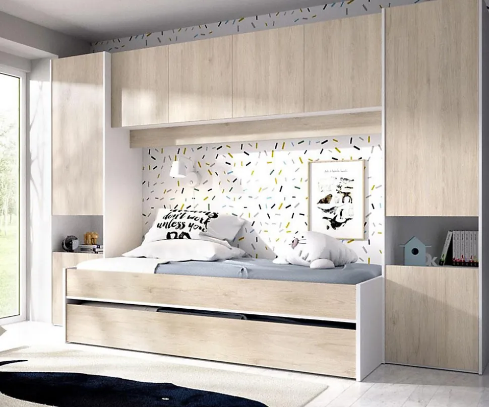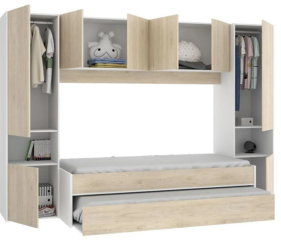 Lit gigogne enfant décor blanc/chêne structure en panneaux de particules mélaminéAvec tiroir utilisable en 2ème couchage ou rangementEnvironnement avec multiples rangementsCouchage 90×190 cmLivré sans matelas, sommier inclus.Dimensions total: Longueur 302 x Hauteur 203 x Profondeur 50-97 cmDimensions totales du lit : Longueur 92 x Profondeur 198 x Hauteur 50cmDimensions totales de l’environnement : Longueur 303 x Profondeur 50 x Hauteur 203 cmDimensions du tiroir lit : Longueur 192 x Profondeur 90 x Hauteur 26 cmCouchage : 90×190 cmMatière : panneaux de particule Coloris : blanc / chênePoids : 212 kg