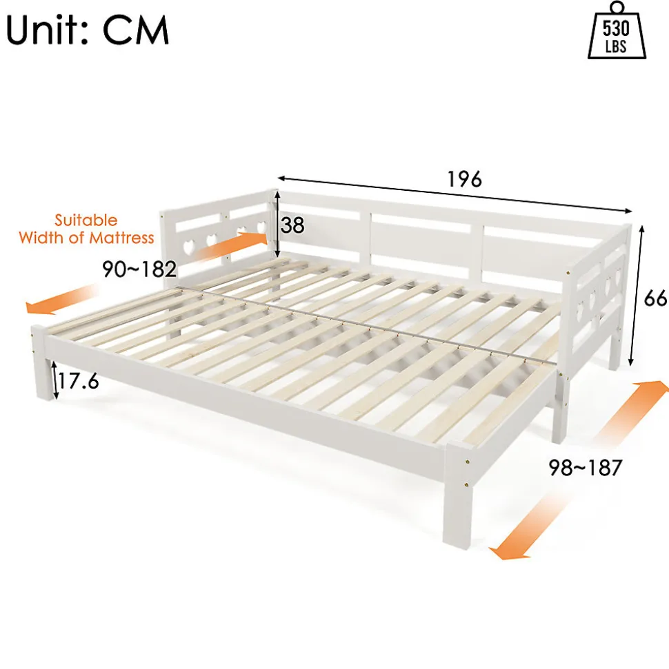 Dimensions totales :196×98-187×66 cm (LxlxH)Capacité de charge :240 kg / 530 lbsCouleur :blancMatériau :Bois de pin+Panneau composite de fibres de bois à densitéSurface de couchage :90×190 cmNombre de paquets : 2Poids net :30.00kgMontage nécessaire : OuiMatelas inclus : NonDesign en forme de cœur : Notre canapé-lit en forme de cœur est un symbole d’amour et de chaleur, qui apporte une touche d’affection dans votre maison. Réaménagez votre espace de vie avec une pièce qui offre non seulement du confort, mais qui symbolise aussi l’amour et la solidarité. Cadre de lit extensible : Nous avons conçu nos lits extensibles pour qu’ils puissent s’adapter à toute poussée de croissance, afin que votre portefeuille n’ait pas à le faire. Tous nos lits extensibles sont testés selon les normes de sécurité les plus rigoureuses, vous pouvez donc vous sentir en sécurité.Fonctionnalité polyvalente : Le lit de jour ouvert est une option flexible pour s’asseoir, dormir ou se détendre. Utilisez-le comme un canapé confortable pendant la journée et comme un lit confortable pendant la nuit, ce qui le rend parfait pour les petits appartements ou les chambres d’amis.Facile d’entretien : La couleur blanche s’harmonise avec tous les décors et est facile à nettoyer, de sorte qu’il reste beau pendant longtemps.Fabriqué pour durer : Cadre de lit solide en bois de pin de Nouvelle-Zélande. Notre cadre de lit est doté d’une quincaillerie de haute qualité et d’articulations renforcées qui assurent la solidité et la robustesse du lit.Dimensions globales du produit :196Lx98-187Wx66H cm Toutes les mesures sont prises manuellement avec un écart possible de 1-3 cm.Avec des instructions graphiques détaillées et les accessoires nécessaires, le cadre de lit est facile à assembler sans prendre trop de temps.