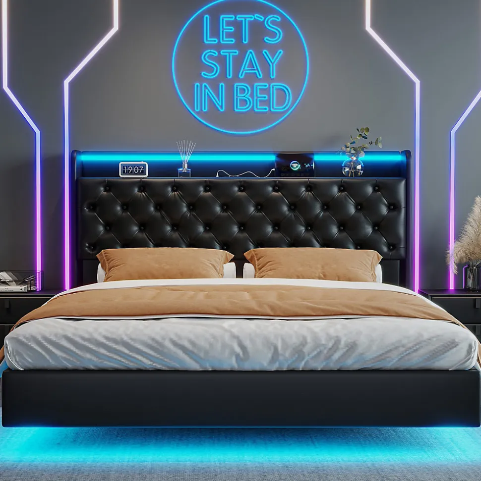 Design Flottant et Élégant Structure moderne avec effet suspendu unique, combinée à des bandes LED intégrées sur le corps et la tête de lit, créant une ambiance lumineuse personnalisable et contemporaine dans votre chambre. Tête de Lit Rembourrée avec Rangement Compartiments pratiques intégrés dans la tête de lit pour garder vos livres, télécommandes, lunettes ou autres objets essentiels à portée de main, tout en offrant un appui confortable pour sasseoir ou lire. Éclairage LED Intégré Haut de Gamme Bande lumineuse sur la tête et le corps du lit, idéale pour créer différentes ambiances (lecture, détente, décoration), avec un rendu lumineux élégant qui souligne le design moderne du lit. Prise Européenne Intégrée Deux ports de charge EU directement sur la tête de lit pour recharger smartphones, tablettes et autres appareils électroniques sans multiprises, combinant praticité et modernité. Surface de Couchage Confortable 160×200cm Lit double standard offrant confort optimal pour deux personnes, revêtement en PU synthétique de haute qualité facile à nettoyer, durable et élégant, idéal pour un intérieur contemporain et fonctionnel. Détails : Dimensions hors tout : 208 x 165 x 106 cmCompatible avec les matelas : 160x 200 cm (matelas non inclus) Pour garantir une expédition en toute sécurité, ce lit sera expédié par lots et pourrait ne pas arriver simultanément. Merci de votre patience.