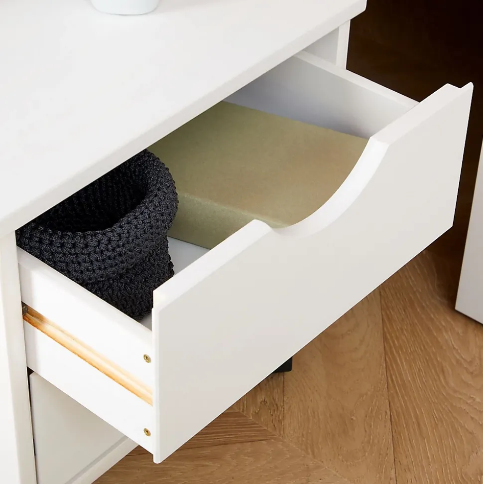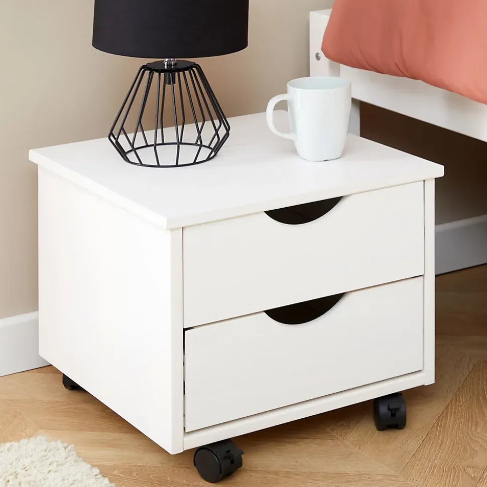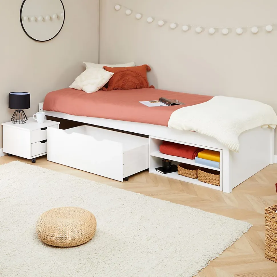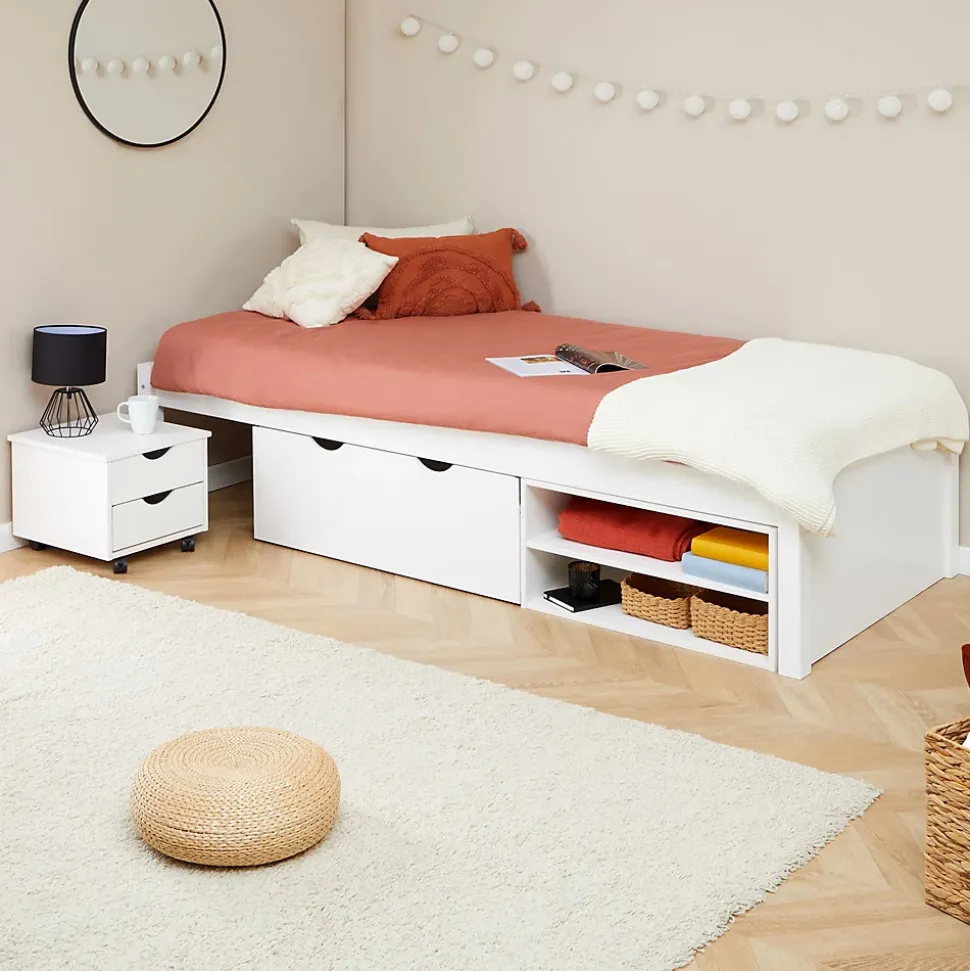 Le lit simple en pin Sabrina … combine style et praticité. Avec son couchage 90×190 cm, sa table de chevet et son grand tiroir sur roulettes, il offre un espace de rangement idéal pour les petits espaces. Une étagère astucieusement intégrée complète ce meuble fonctionnel, conçu pour simplifier votre quotidien tout en apportant une touche chaleureuse à votre intérieur. Description des matériaux : – Le cadre de lit est fabriqué en pin massif et recouvert d’une lasure de coloris blanc. – La madrure du bois reste visible. Caractéristiques du produit : – Couchage 90 x 190 cm – Dimensions de la table de chevet (L x H x P) : 39 x 35 x 39 cm – Dimensions intérieurs des tiroirs (L x H x P) : 30 x 11 x 32 cm – Dimensions du grand caisson à roulettes (L x H x P) : 86 x 29 x 47 cm – Dimensions intérieures des 2 niches (L x H x P) : 56 x 16 x 35 cm Livraison et montage : – Contenu de la livraison : lit, sans décoration, notice de montage – Le produit est livré en pièces détachées – Assemblage facile grâce à la notice – Sans matelas et sans sommier – Photo non contractuelle Résumé: – Dimensions pieds: 55 x 55 mm – Hauteur cadre de lit: 12 cm – Hauteur pan de lit: 48 cm – Hauteur pied de lit: 48 cm – Hauteur tête de lit: 48 cm – Profondeur d’insertion: 9 cm – Convient uniquement avec: Sommier fagot à lattes – Extras: Avec tiroirs – Nombre de compartiments: 2 – Nombre de tiroirs: 1 – Nombres de grands tiroirs: 1 – Sommier: vendu séparément – Surface: Lasuré – Grand tiroir: Profondeur: 47 cm – Hauteur façade: 12 cm – Largeur tiroir: 31 cm – Profondeur tiroir: 34 cm – Dimensions monté: 49 x 98 x 201 cm (H x L x L) – Couchage: 90 x 190 cm – Couleur: Blanc – Matériel: Pin massif