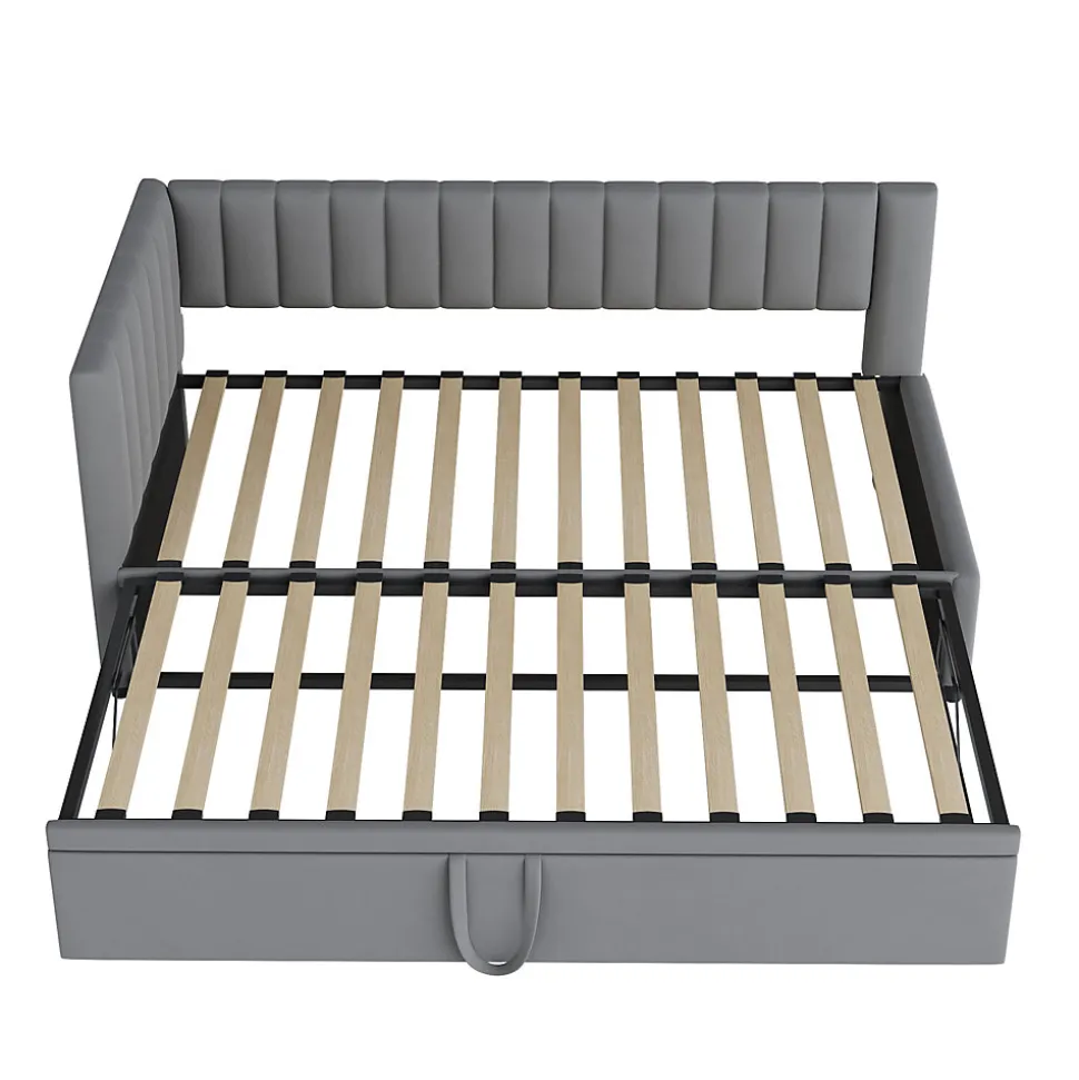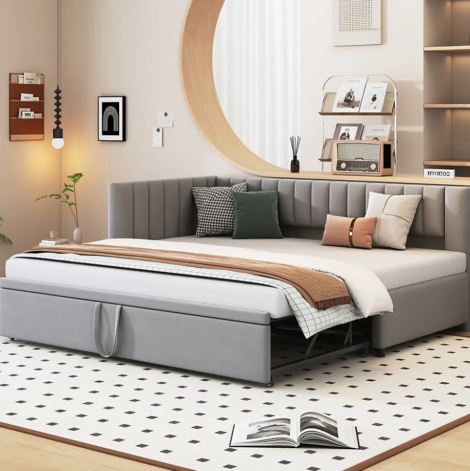▶ ▶ Détails ▶────────────────● Nom du produit : Lit gigogne● Dimensions totales du produit : 208 x 97,5 x 75 cm● Nombre de colis : 2● Poids total du produit : 45 kg● Capacité de poids : 120 kg● Épaisseur de matelas recommandée : 6-10 cm● Dimensions : 90 x 200 cm / 180 x 200 cm (matelas non inclus)● Couleur : Gris clair● Matériaux du produit : Velours + Contreplaqué + MDF● Poids total du colis : 49 kg● Nombre de lattes : 24● Temps estimé pour l’assemblage : 1 heure● Nombre de personnes recommandé : 2● Outils supplémentaires nécessaires : Tous les outils inclus (tournevis)► Remarques ►※ Ce produit sera livré en 2 colis, qui peuvent arriver séparément. Veuillez patienter.※ En raison des mesures manuelles, un écart de 2 à 3 cm peut se produire.※ En fonction de l’éclairage, il peut y avoir des différences de couleur entre l’image du produit et le produit réel. Veuillez vous référer au produit que vous recevez.※ Si vous avez des questions pendant l’installation, veuillez nous contacter dès que possible.