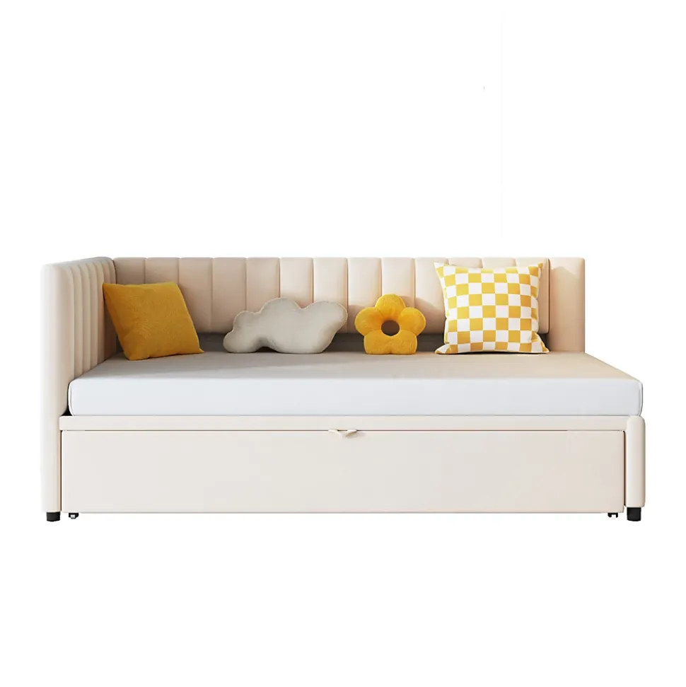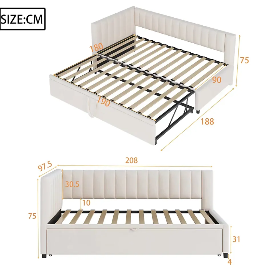 ▶ ▶ Détails ▶────────────────● Nom du produit : Lit gigogne● Dimensions totales du produit : 208 x 97,5 x 75 cm● Dimensions détaillées du produit : Veuillez consulter l’image des dimensions● Nombre de colis : 2● Poids total du produit : 45 kg● Capacité de poids : 120 kg● Épaisseur de matelas recommandée : 6-10 cm● Dimensions du matelas : 90 x 200 cm / 180 x 200 cm (matelas non inclus)● Couleur : Beige● Matériaux du produit : Velours + Contreplaqué + MDF● Poids total du colis : 49 kg● Nombre de lattes : 24● Temps estimé pour l’assemblage : 1 heure● Nombre de personnes recommandé : 2● Outils supplémentaires nécessaires : Tous les outils inclus (tournevis)► Remarques ►※ Ce produit sera livré en 2 colis, qui peuvent arriver séparément. Veuillez patienter.※ En raison des mesures manuelles, un écart de 2 à 3 cm peut se produire.※ En fonction de l’éclairage, il peut y avoir des différences de couleur entre l’image du produit et le produit réel. Veuillez vous référer au produit que vous recevez.※ Si vous avez des questions pendant l’installation, veuillez nous contacter dès que possible.