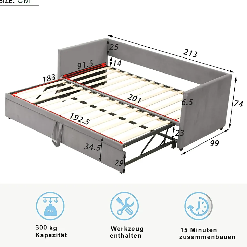 ▶ ▶ Détails ▶────────────────● Type de produit : Lit gigogne● Matériau : Tissu en velours, rembourrage● Couleur : Gris● Dimensions totales du produit (L × l × H) : 213 × 99(188) × 74 cm● Poids : 45 kg● Nombre de colis : 2● Poids total des colis : 51,55 kg● Dimensions du matelas : 90 × 200 cm (extensible à 180 × 200 cm)● Lattes : Incluses► Remarques ►※ Ce produit propose des services personnalisés. Pour plus de détails, veuillez contacter le vendeur.※ En raison de la mesure manuelle, il peut y avoir une différence de 2 à 3 cm.※ Toutes les images du produit ont été prises avec des produits réels, mais des différences de couleur peuvent apparaître en raison de l’éclairage ou des différences d’écran.