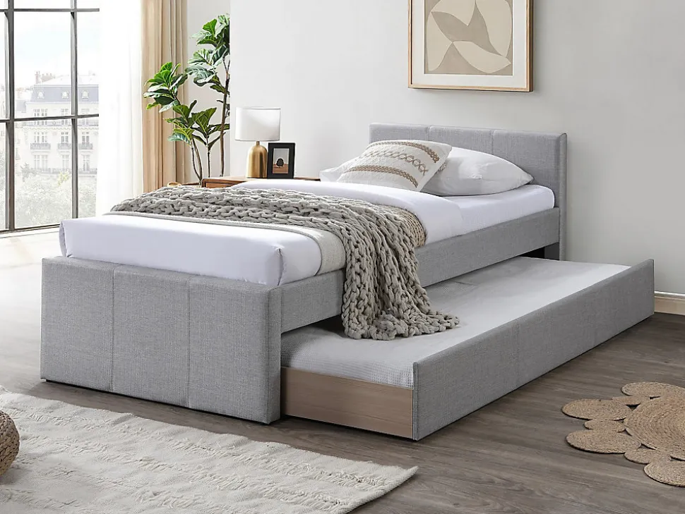 - Lit gigogne 90 x 190 cm – Structure : Panneaux de particules et MDF – Revêtement : Tissu – Coloris : Gris – Dim : L208,5 x P95 x H76,7 cm – Style : Moderne- Le confort malin pour les petites chambres avec le lit gigogne DORITALO !