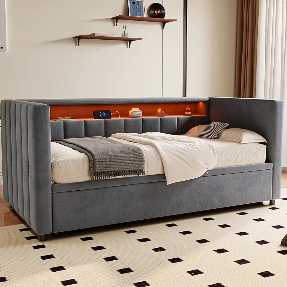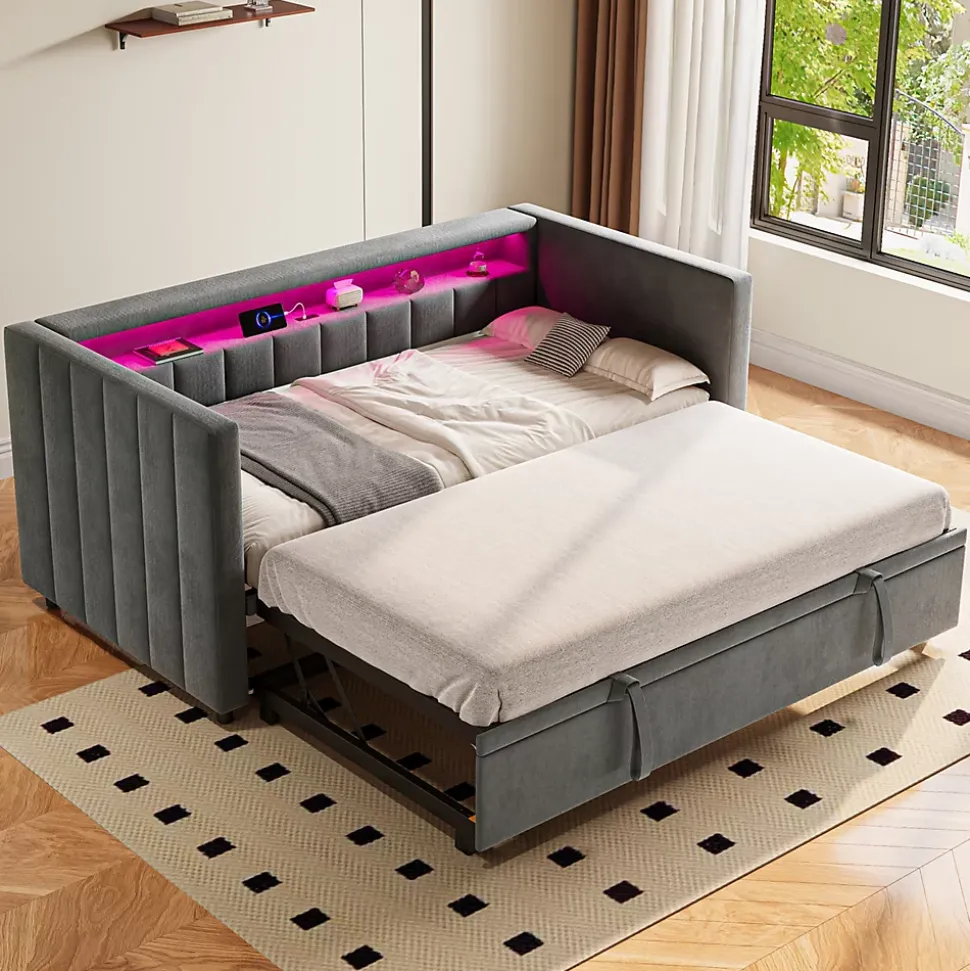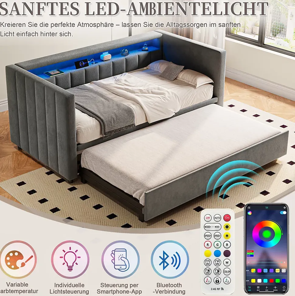 - 【Éclairage LED Ambiance】 Les LED intégrées créent une ambiance chaleureuse et agréable. Vous pouvez ajuster la luminosité pour l’adapter à vos besoins, que ce soit pour une soirée tranquille, une veilleuse douce ou une atmosphère apaisante, tout en mettant en valeur le revêtement en velours du canapé-lit.