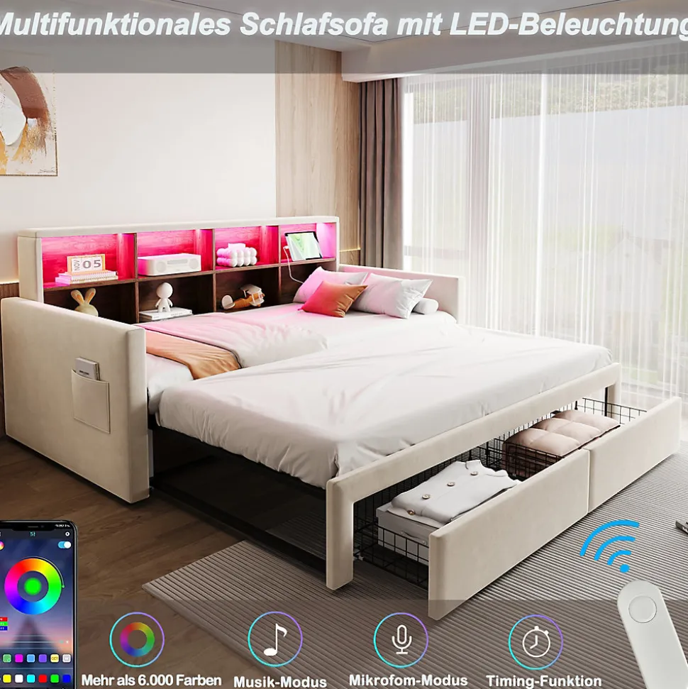 ▶ ▶ Détails ▶────────────────● Type de produit : Lit extensible● Dimensions de la surface de couchage : 90 × 190 cm (sans matelas)● Couleur : Beige● Matériaux du produit : Velours + Métal + Contreplaqué + MDF● Dimensions totales du produit : 204 × 104 × 96 cm● Poids du produit : 46 kg● Capacité de charge : 300 kg● Nombre de lattes : 21● Epaisseur de matelas recommandée : 6 à 8 cm● Nombre de colis : 2● Poids total des colis : 50 kg● Montage requis : Oui● Temps de montage estimé : Environ 1 heure● Nombre de personnes recommandé : 2● Outils supplémentaires : Tous les outils inclus (tournevis requis)● Utilisation d’outils électriques à éviter : Oui● Design unique : Tête de lit avec compartiments de rangement intégrés, bande lumineuse LED, prises de charge, deux tiroirs sous le lit► Remarques ►※ Ce produit est livré en 2 colis.※ Des écarts de 1 à 3 cm peuvent survenir en raison des mesures manuelles.※ Des variations de couleur peuvent apparaître en raison de la lumière ou de l’affichage des écrans.※ Veuillez vérifier tous les accessoires avant le montage.※ Ce produit prend en charge les personnalisations sur mesure, veuillez contacter le vendeur pour plus de détails.