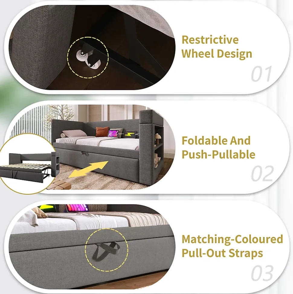 ▶ ▶ Détails ▶────────────────● Dimensions totales : 98 x 207 x 74 cm● Matériau principal : Bois + Coton + Métal● Couleur : Gris● Montage : Requis● Contenu du colis : Lit principal + Lit gigogne + Station de charge● Matelas applicable (lit principal) : 90 x 190 cm (Matelas non inclus)● Épaisseur de matelas recommandée : 15 cm● Poids maximal utilisateur : 150 kg● Nombre de colis : 2● Poids net / brut : 48,85 kg / 54,29 kg► Remarques ►※ Ce produit est livré en 2 colis, qui peuvent arriver séparément. Merci de patienter.※ Les mesures manuelles peuvent entraîner une erreur de 2–3 cm.※ Des différences de couleur peuvent apparaître entre l’image du produit et le produit réel en raison de l’éclairage. Veuillez vous référer au produit réellement reçu.