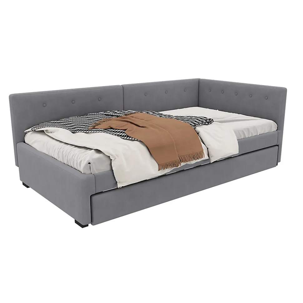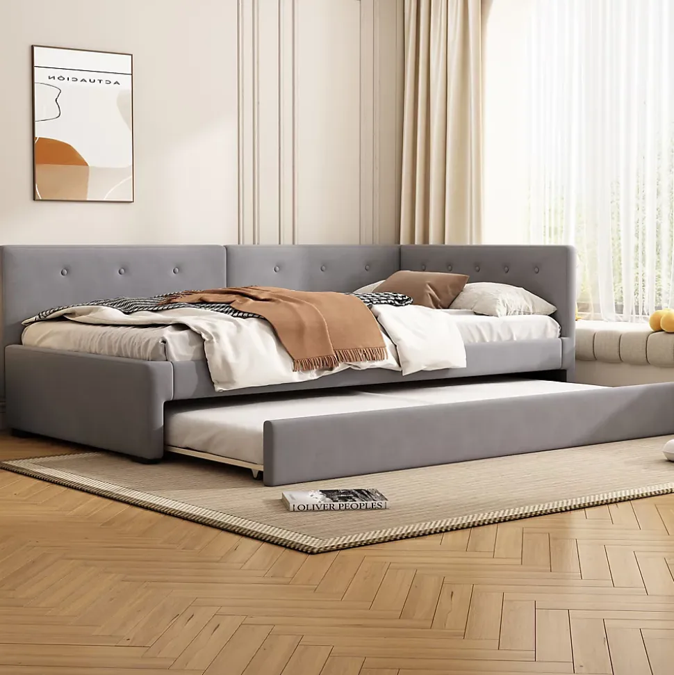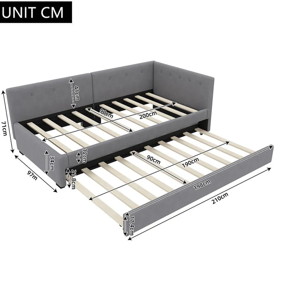 ▶ ▶ Détails ▶────────────────✦ Nom du produit : Lit gigogne✦ Dimensions du produit : 205 × 97 × 71 cm✦ Matériau du lit : Velours✦ Dimensions du lit : 90 × 200 cm & 90 × 190 cm (sans matelas)✦ Couleur : Gris✦ Nombre de colis : 2✦ Montage requis : Oui✦ Dimensions intérieures du lit : 90 × 200 cm✦ Hauteur totale : 71 cm✦ Capacité de charge : 114 kg✦ Nombre de lattes : 10 pcs✦ Épaisseur recommandée pour le matelas : 10–15 cm✦ Dimensions intérieures du lit gigogne : 90 × 190 cm✦ Capacité de charge du lit gigogne : 80 kg✦ Épaisseur recommandée pour le matelas du lit gigogne : 10 cm► Remarques ►※ Ce produit est livré en 2 colis, qui peuvent ne pas arriver en même temps. Merci de bien vouloir patienter.※ En raison de mesures manuelles, une erreur de 2–3 cm peut survenir.※ En raison de l’éclairage, il peut y avoir de légères différences de couleur entre l’image du produit et le produit réel. Veuillez vous référer au produit réellement reçu.※ Si le client rencontre des questions lors de l’installation, veuillez nous contacter dès que possible.
