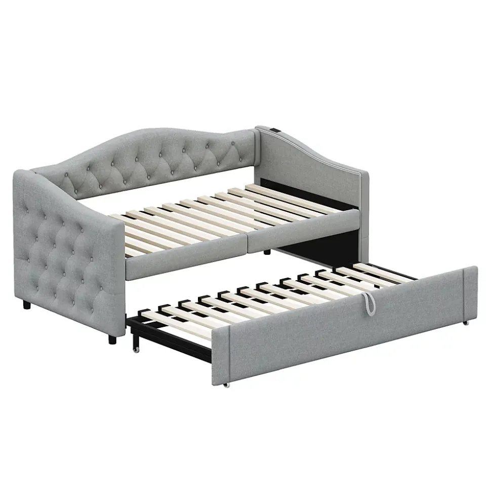 ▶ ▶ Détails ▶────────────────● Nom du produit : Lit gigogne● Dimensions totales du produit : 213 x 95 x 80 cm● Dimensions détaillées : Veuillez consulter l’image des dimensions● Nombre de colis : 2● Capacité de charge : 300 kg● Épaisseur de matelas recommandée : 12-14 cm (90 x 200 cm)● Épaisseur de matelas recommandée pour le lit extensible : 8-10 cm (90 x 190 cm)● Taille : 90 x 200 cm (sans matelas)● Couleur : Gris● Matériaux : Lin + Métal + Contreplaqué + MDF● Nombre de lattes : 24● Poids total du produit : 51 kg● Poids total du colis : 55 kg● Niveau de montage : Montage complet requis / Montage partiel● Temps de montage estimé : 1 heure● Nombre de personnes recommandé : 2● Outils supplémentaires requis : Tous les outils inclus / Tournevis● Évitez l’utilisation d’outils électriques : Oui► Remarques ►※ Ce produit est expédié en 2 colis. Ils peuvent arriver séparément. Veuillez patienter.※ En raison de la mesure manuelle, une erreur de 2 à 3 cm peut se produire.※ En raison des conditions d’éclairage, il peut y avoir une légère différence de couleur entre l’image du produit et le produit réel. Veuillez vous référer au produit reçu.※ Si le client rencontre des questions lors de l’installation, veuillez nous contacter dès que possible.