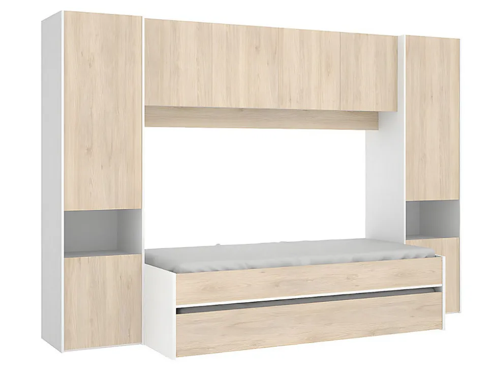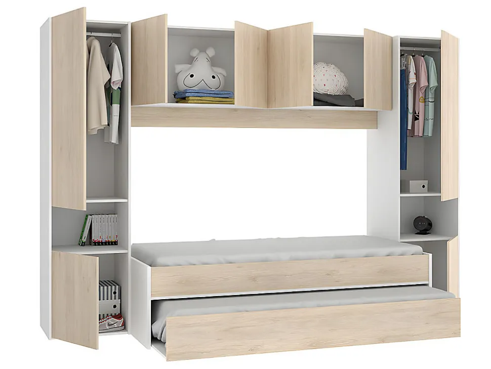 A la recherche d’un lit astucieux pour la chambre de votre enfant ? Le lit gigogne SELENA saura répondre à toutes vos attentes ! Grâce à son pont de lit, ce lit vous offre de nombreux rangements qui vous permettront d’organiser facilement la garde-robe ainsi que les jouets de votre enfant. Par ailleurs, sa fonction de lit gigogne vous permettra de passer aisément de 1 à 2 couchages en tirant le tiroir caché sous le lit.1 x Cadre de lit SELENACaractéristiques Couleur (nuance) : Naturel clair Matière (précision) : Panneau de particule Finition : Mélaminé Taille (couchage) : 90 x 190 cm Nombre de places : 1 place Avec sommier Type de sommier : Sommier plein en panneau 8 portes Porte battante Mécanisme ouverture (porte) : Prise de main Type de rangement : Niche Tiroir coulissant Gamme : Good for Planet Produit : Fabriqué en Europe Charge maximale supportée : 75 kg À monter soi-même Finition : Mélaminée Nombre de penderies : 2 Nombre de niches : 2 : Compatible avec tous les sommiers et matelas 90×190 cm Epaisseur maximum du matelas pour lit gigogne : 15 cmDimensions Longueur : 303 cm Hauteur : 203 cm Profondeur : 97 cm1 x Matelas classique ZEUSCaractéristiques Technologie (âme) : Mousse Soutien : Ferme Densité (âme) : 25 kg/m³ Technologie matelas (accueil) : Mousse de confort Densité (accueil) : 20 kg/m³ Accueil : Tonique Garnissage du matelas : Ouate hypoallergénique Densité (garnissage) : 400 g/m2 Coutil (matière) : Polyester Couleur (nuance) : Blanc Matière (précision) : 45 % Polyester Composition % tissu Polypropylène : 55 % Taille (couchage) : 90 x 190 cm Nombre de places : 1 place Traitement : Anti-acariens, Anti-bactériens Gamme : Good for Planet Garantie : 5 ans Produit : Mousse CertiPUR, Fibre OEKO-TEX, Fabriqué en France Compressé/roulé : Compressé/rouléDimensions Longueur : 190 cm Hauteur : 15 cm Profondeur : 90 cm Epaisseur matelas : 15 cm Hauteur de l’âme : 12 cm1 x Matelas gigogne SANJICaractéristiques