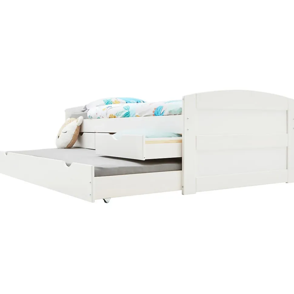 Le lit gigogne Jessy … conviendra parfaitement pour la chambre de votre enfant. Grâce à son tiroir-lit, vous pourrez facilement disposer d’un couchage supplémentaire, très pratique lorsque votre enfant invite ses amis à dormir à la maison. Les trois grands tiroirs vous seront très utile pour y ranger toutes ses jouets et autres affaires. A la fois pratique et fonctionnel, ce lit trouvera aisément sa place, même dans les petits espaces. Avec son style classique et élégant, il se mariera trsè bien avec le reste de votre mobilier ! Description des matériaux : – La structure du lit est en pin massif, et recouvert d’une lasure de coloris blanc. – La madrure du bois reste visible. Caractéristiques du produit : – Couchage du lit : 90 x 190 cm – Couchage du tiroir-lit : 90 x 190 cm – Hauteur de matelas conseillé pour le tiroir-lit : 14 cm – 3 grands tiroirs – Dimensions des tiroirs (L x H x P) : 58 x 12 x 58 cm Livraison et montage – Contenu de la livraison : lit gigogne avec 3 tiroirs et tiroir-lit, sans décoration, notice de montage – Le produit est livré en pièces détachées – Assemblage facile grâce à la notice – Sans matelas et sans sommier – Photo non contractuelle Résumé: – Convient uniquement avec: Sommier fagot à lattes – Extras: Avec tiroir-lit – Nombres de tiroirs: 3 – Sommier: vendu séparément – Surface: La madrure du bois reste visible – Hauteur façade: 12 cm – Largeur tiroir: 58 cm – Profondeur tiroir: 58 cm – Dimensions monté: 63 x 98 x 194 cm (H x L x L) – Couchage: 90 x 190 cm – Couleur: Blanc – Matériel: Pin massif