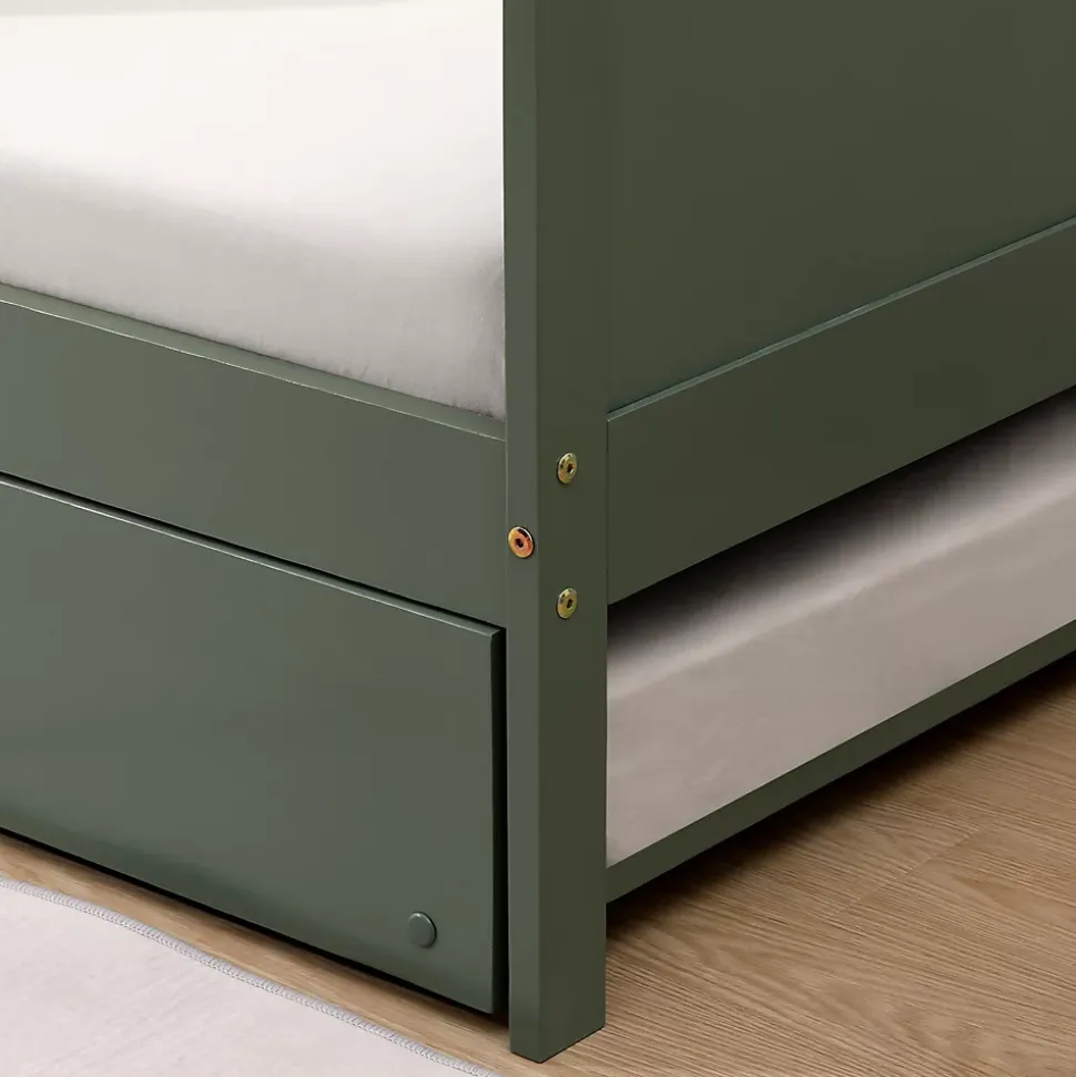 Description : Le lit ADAM, mesurant 190x90cm, est idéal pour la chambre de votre enfant. Fabriqué en bois de pin avec des lattes contreplaquées, il assure robustesse et confort. Son design épuré s’intègre parfaitement dans tout style de décoration. Le lit ADAM est équipé d’un tiroir-lit pratique, parfait pour héberger un invité ou pour une soirée pyjama entre frères et sœurs. Ce lit astucieux optimise l’espace et aide à garder la chambre bien organisée ! Détails : Dimensions : – Lit : L 195 x l 96 x H 60cm- Matelas requis : L 190 x l 90cm- Hauteur max. matelas : 20cm- Hauteur de la barrière : 60cm- Hauteur sous sommier : 21,2cm- Lit tiroirs : L 190 x l 94 x H 21,5cm- Matelas lit tiroirs requis : L 190 x l 90 x H 13cm- Pieds : L 5 x l 5 x H 21,2cm Matières : – Lattes : contreplaqué- Structure : bois de pin Couleurs : – Structure : vert Informations complémentaires : – Utilisation : intérieur- Type de public : enfant- Type d’utilisation : quotidienne- Type de lit : gigogne- Nombre de couchage : 2 x 1 personne- Sommier à lattes inclus- Tiroirs-lit inclus- Matelas non inclus- Poids max. supporté lit : 160kg / lit tiroir : 150kg- À monter (notice incluse) – Garantie : 2 ans Livraison : Contenu colis : 1 lit + 1 lit-tiroirLivraison effectuée en pas de porte, en bas d’immeuble – Livraison en 1 colisColis 1 : L 199 × l 35 × H 14,5cm – poids brut : 18kg / poids net : 16,5kgColis 2 : L 200 × l 25 × H 12cm – poids brut : 13kg/poids net : 12kg