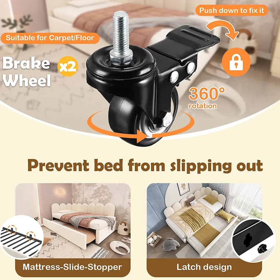 - 【Sécurité et Fixation Pratiques】 Des attaches latérales maintiennent le lit principal lorsqu’il n’est pas utilisé, tandis que les roulettes du lit gigogne, dont certaines avec freins, garantissent stabilité et sécurité, assurant un environnement de sommeil sûr.