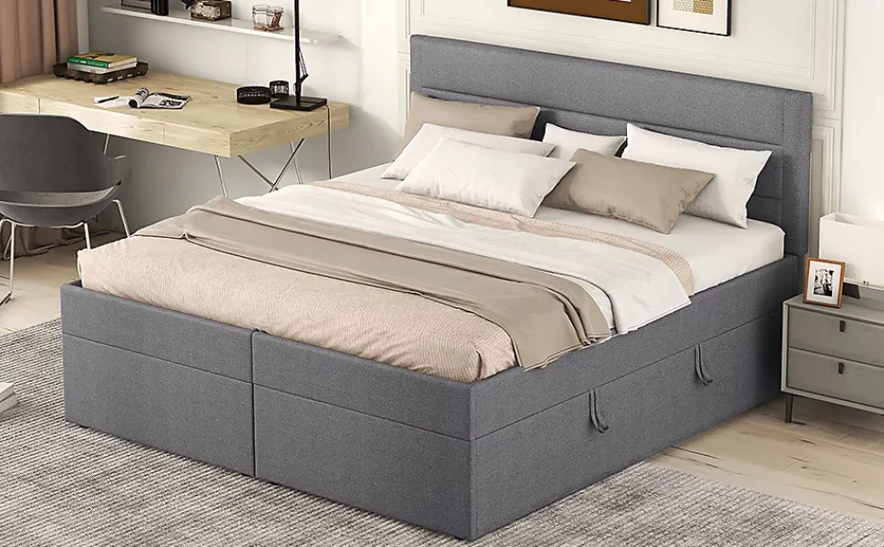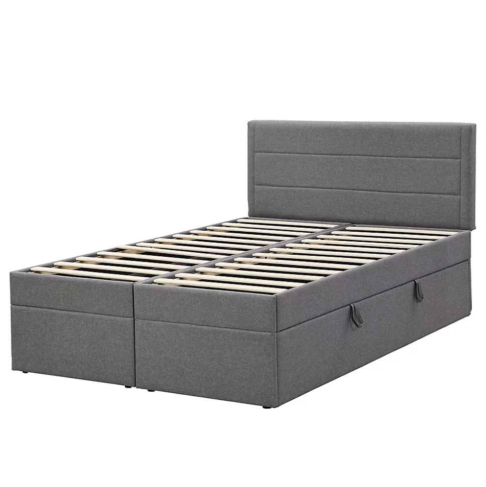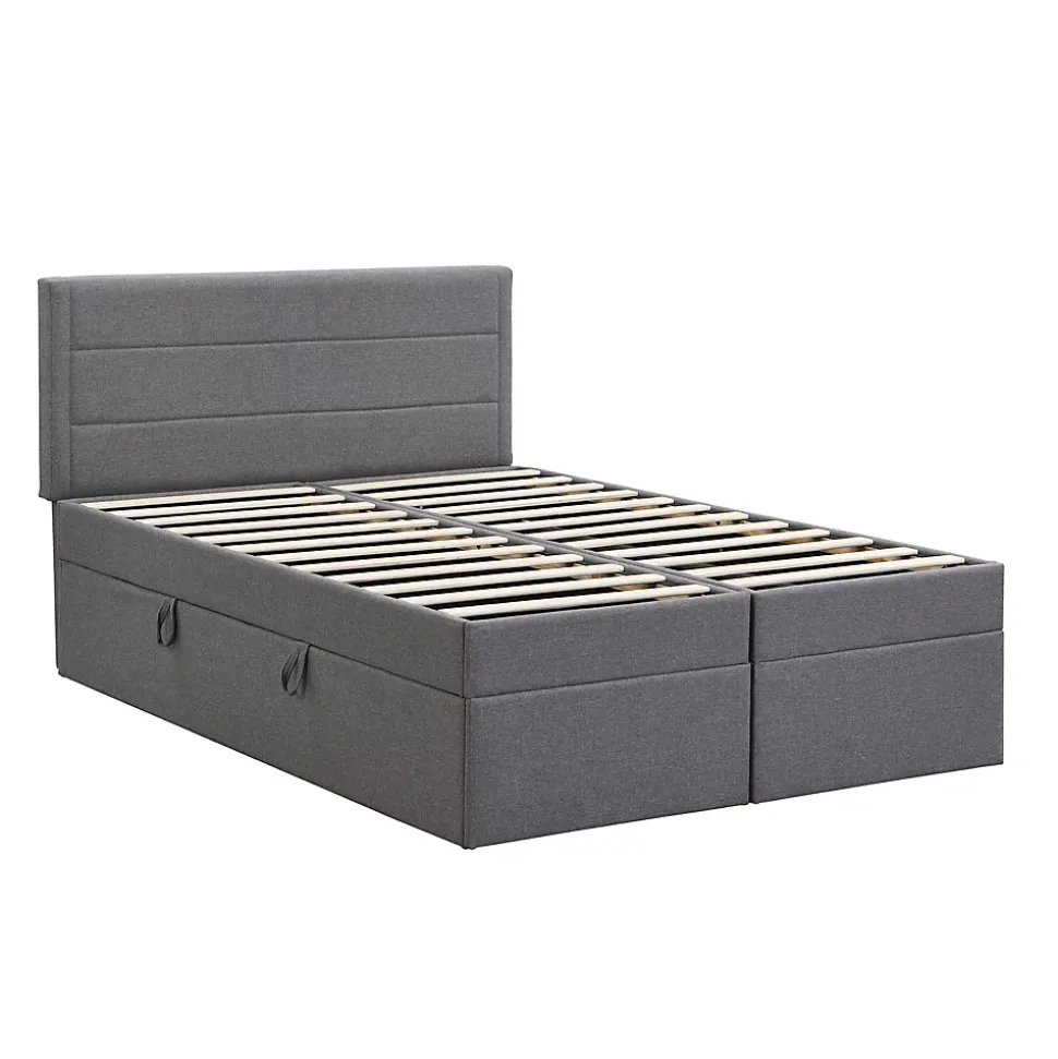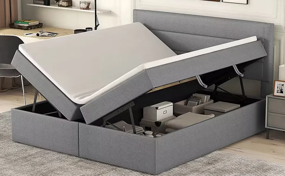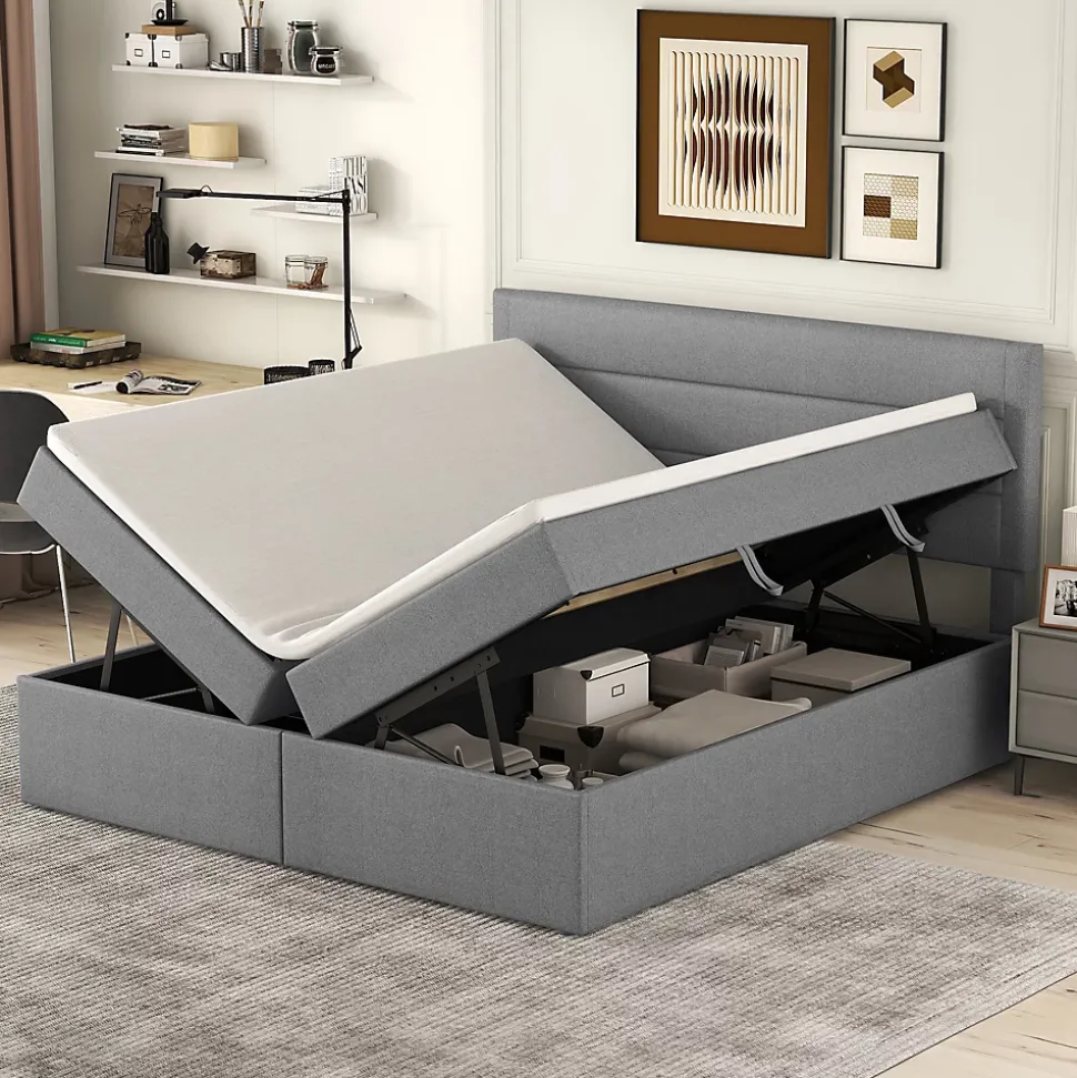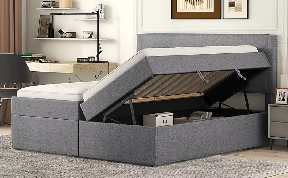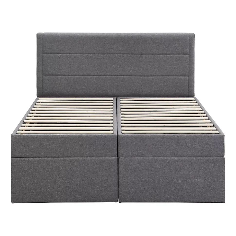 This double bed features ample storage space beneath the slats, ideal for storing blankets and pillows. The metal and wood frame, wrapped in linen, offers a comfortable sleep experience while the neutral color blends well with most decor styles. The lift-up slats are easy to operate, making it perfect for those who need extra storage without sacrificing comfort.Features:Material: LinenDimensions: 207 x 141 x 105 cmWeight Capacity: 181 kgNumber of Slats: 24 pcsAssembly Required: YesOrigin: ChinaBenefits:Comfortable Sleep: Linen-covered bed with a sturdy metal frame ensures maximum comfort.Efficient Storage: Lift-up slats provide extra storage for bedding and other items.Versatile Design: The neutral color fits seamlessly into various interior styles.Durable Construction: Supports up to 181 kg, ensuring long-term stability and durability.Delivery: Ships in three packages from Germany, with potential staggered arrivals.