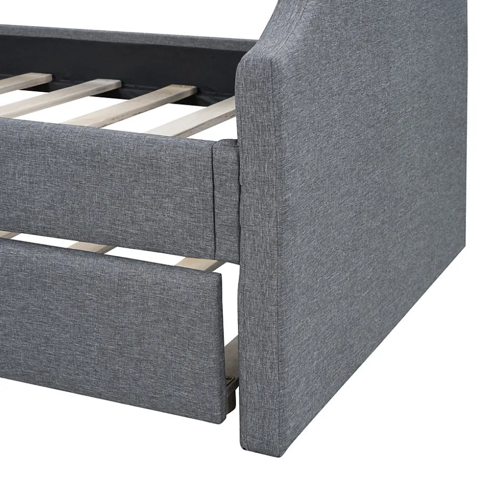 Canapé-lit avec Lit Escamotable, GrisTransformez votre salon en chambre d’amis grâce à ce canapé-lit pratique. Il offre une place pour deux personnes en haut et un lit escamotable pour deux autres en dessous, idéal pour les familles ou les invités. Fabriqué avec un cadre en bois massif et un revêtement en polyester gris, il s’intègre facilement dans de nombreux styles de décoration intérieure.Caractéristiques principales :Design confortable : Le dos incurvé et les accoudoirs offrent un excellent soutien pour se détendre.Lit escamotable : Le lit escamotable se déplie facilement grâce à des roulettes pratiques, offrant ainsi un couchage supplémentaire.Matériaux robustes : Le polyester et le contreplaqué assurent la durabilité et la résistance.Montage facile : Toutes les pièces sont étiquetées pour un montage facile et rapide.Dimensions :Dimensions du produit : 213 x 97 x 81 cmDimensions du lit / Lit escamotable : 90 x 200 cm / 90 x 190 cmHauteur totale : 81 cmCapacité de charge : 120 kgNombre de lattes : 10Recommandation pour l’épaisseur du matelas : 15-20 cm pour le canapé-lit, 10-25 cm pour le lit escamotableMontage requis : OuiOrigine : Vietnam