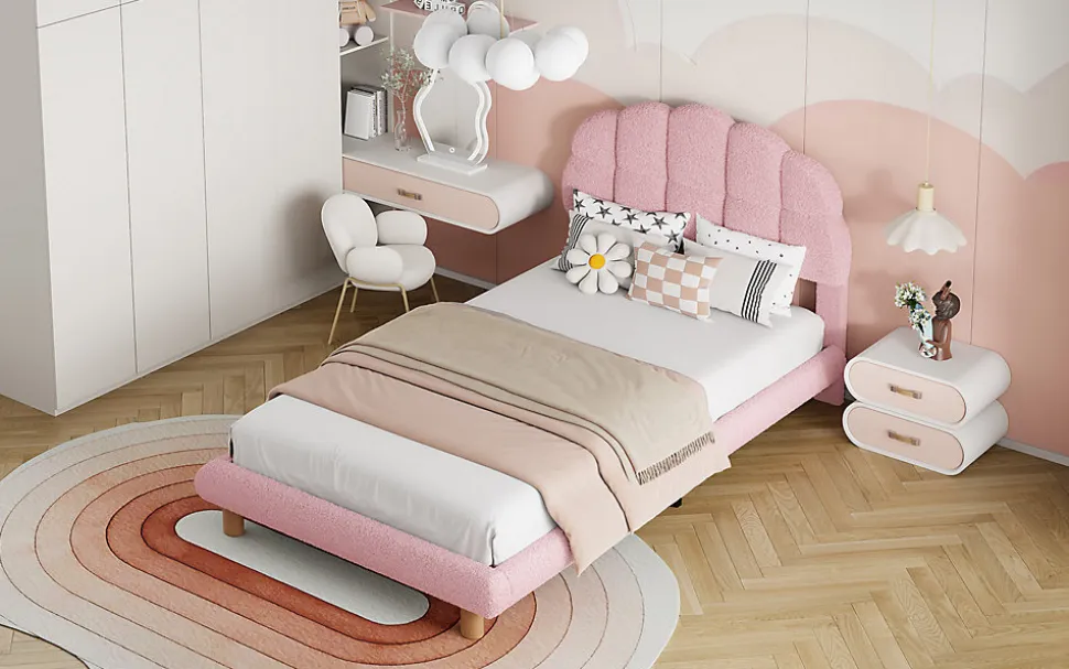 Lit Simple pour Enfant, Lit pour Jeune, Lit Rembourré, Sommier en Bois, avec Tête de Lit et Côtés RembourrésCe lit pour enfant allie confort et sécurité. Son design élégant et sa forme de tête de lit rembourrée assurent à votre enfant un sommeil paisible et sécurisé. Fabriqué à partir de matériaux de haute qualité tels que le Cercle Vlies et le MDF, il offre une surface douce et agréable. Ce lit est parfait pour les enfants de tous âges, avec une structure solide et fiable.Caractéristiques principales :Design élégant : Tête de lit semi-circulaire et couleurs pastel qui apportent douceur et beauté à la chambre.Matériaux de qualité : Fabriqué en Cercle Vlies et MDF, offrant une sensation de confort et une durabilité accrue.Construction robuste et sûre : Le cadre stable avec des pieds métalliques assure une solidité optimale.Hauteur modérée : Permet aux enfants de monter et descendre facilement du lit.Sécurité renforcée : La tête de lit rembourrée protège contre les chocs accidentels.Dimensions :Dimensions du produit : 205 x 98 x 99 cmDimensions du matelas : 90 x 200 cmHauteur totale : 99 cmPoids maximal supporté : 150 kgNombre de lattes : 12Recommandation pour l’épaisseur du matelas : 15-25 cmMontage requis : OuiOrigine : Chine