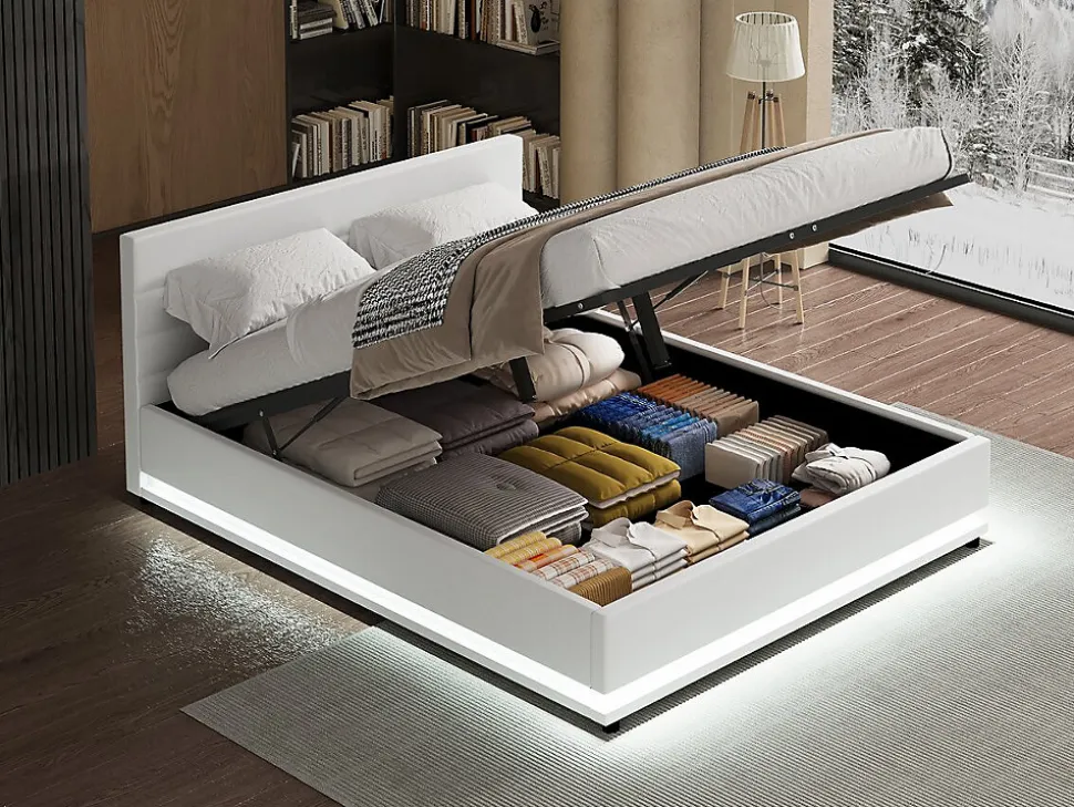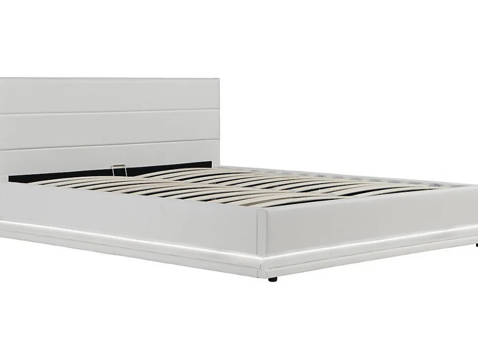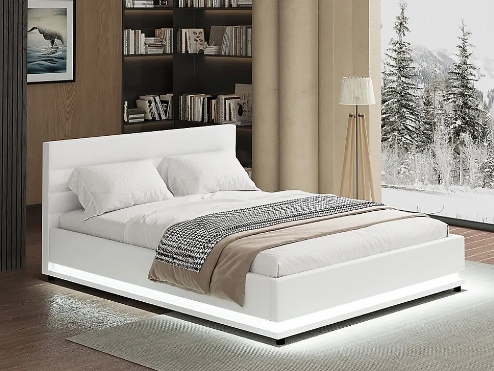 Lit avec LED « Anastasia » – Blanc – Dimensions matelas : 160 x 200 cm – Dimensions lit : 171 x 213 x 90.5 cm – MDF + Bois + PVC – Tête de lit fournie – Coffre de rangement – Avec sommier à lattes – Matelas en option .Descriptif: Lit 2 places160 x 200 cmEclairage LEDTête de lit L171 x H90.5 cm- Pied de lit L171 x H33 cmDesign sobre et moderneSupporte jusqu’à 250 kgMatelas non fourni. Matière(Filtre): Simili cuir. Matières: Simili cuir. Structure: bois. Couleurs: blanc. Finition: Led. couleur (filtre): Blanc. Dimensions: 171 x 213 x 90 cm. Dimensions du couchage: 160 x 200 cm. Dimensions (Filtre): 160 x 200 cm. Sommier: inclus. Sommier: 75 x 5 x 1 cm – bois – Amovibles – 24 lattes. Coffres: 141 x 191 x 23 cm. pieds: 3 x 3 x 2.5 cm – Acier. Poids: 74.5 kg. Colisage: 4 colis : – 1,71 x 0,1 x 0,905 m, 14,6 kg – 1,945 x 0,07 x 0,36 m, 26,4 kg – 2,045 x 0,135 x 0,34 m, 26,4 kg – 1,95 x 0,1 x 0,24 m, 22,75 kg.