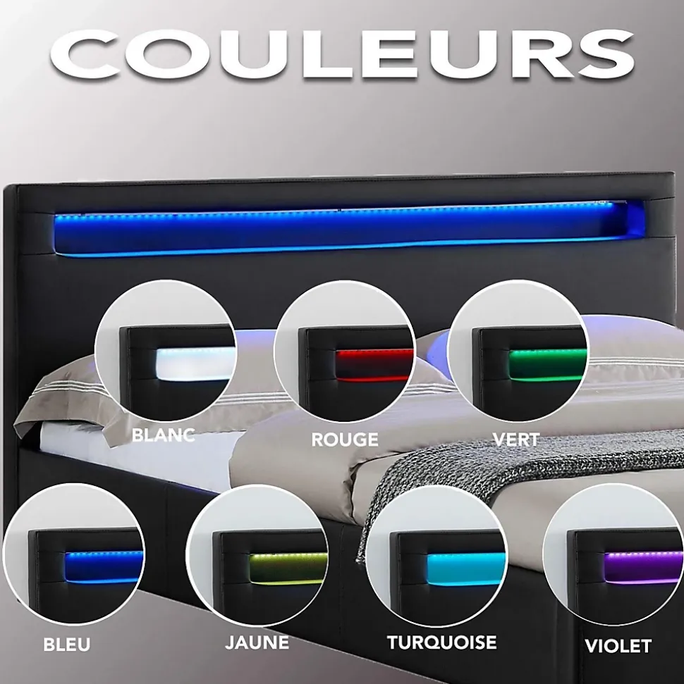 • Dimensions du lit LED 140×190 cm (L x H x P) : 206 x 80 x 146 cm• Lit double avec sommier à lattes, recouvert d’un revêtement synthétique de coloris noir. Les pieds sont en plastiques de coloris noir• La tête de lit intègre un éclairage LED avec 7 couleurs différentes, à choisir selon vos envies et que vous pourrez facilement contrôler grâce à la télécommande (incluse)• Ce lit moderne apportera une touche design dans votre chambre où vous pourrez créer l’ambiance et l’atmosphère de votre choix• Le revêtement en simili est particulièrement confortable et moelleux, parfait pour regarder vos séries ou lire un bon livre dans votre lit