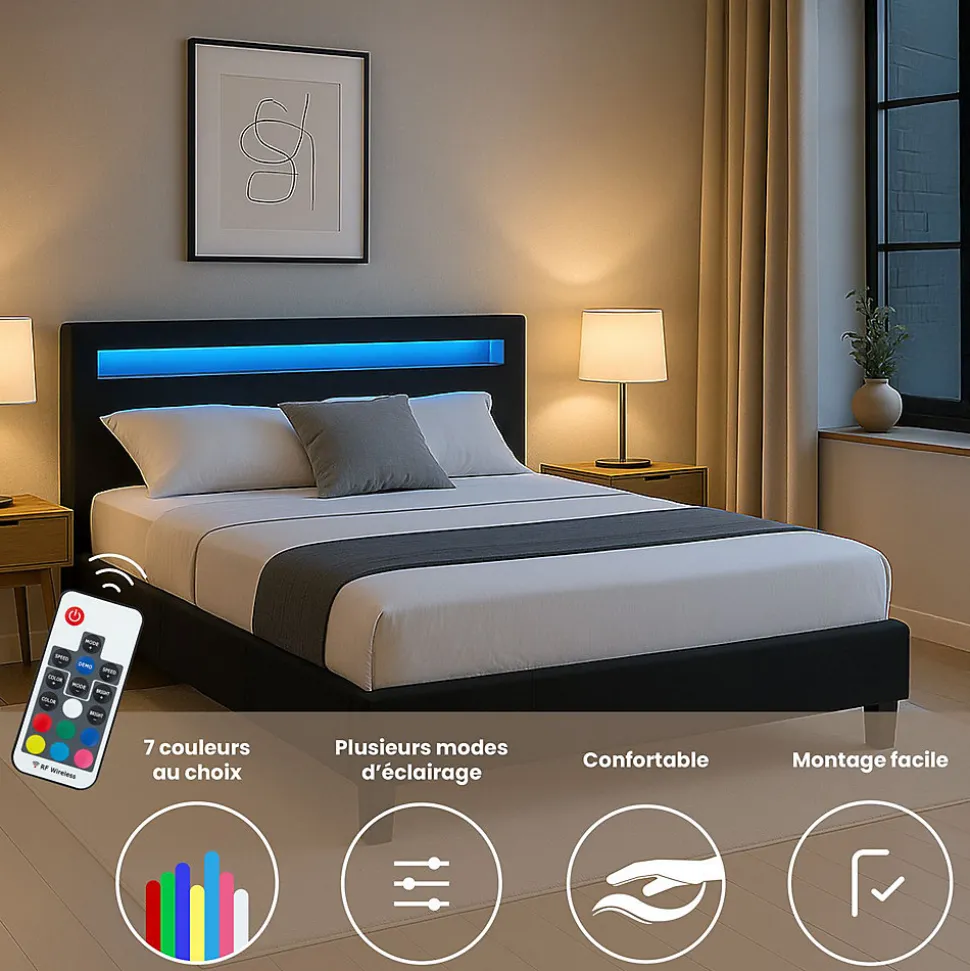 Le lit led double Rioja … apportera à coup sûr une touche de modernité dans votre chambre à coucher. Sa tête de lit rembourrée contient un éclairage LED, dont vous pourrez modifier à volonté la couleur et les effets de lumière selon vos envies. Le design élégant de ce lit est également marqué par son revêtement en tissu. La stabilité du lit est assurée par 4 pieds robustes et renforcée par la présence d’une traverse centrale et de 2 pieds de soutien supplémentaire sous le sommier à lattes, ce dernier est inclus dans la livraison. Description des matériaux : – Le cadre du lit est revêtu d’un tissu de coloris noir. – Les pieds du lit sont en plastique de coloris noir. Caractéristiques du produit : – Hauteur des pieds : 10 cm – Hauteur du sommier : 26 cm – Epaisseur tête de lit : 9 cm – Eclairage avec LED intégrées et non interchangeables – Avec télécommande et alimentation (longueur de câble : 210 cm) Livraison et montage : – Contenu de la livraison : lit, sommier, notice de montage – Le produit est livré en pièces détachées – Assemblage facile grâce à la notice – Livré sans matelas et sans décoration – Photo non contractuelle Résumé: – Hauteur pan de lit: 30 cm – Hauteur pied de lit: 30 cm – Hauteur tête de lit: 80 cm – Profondeur d’insertion: 5 cm – Convient uniquement avec: Sommier fagot à lattes – Description du matériel: 100% Polyester – Extras: Avec sommier à lattes – Traverse avec pied d’appui: Oui – Dimensions monté: 80 x 146 x 206 cm (H x L x L) – Couchage: 140 x 190 cm – Couleur: Noir – Matériel: Tissu de recouvrement